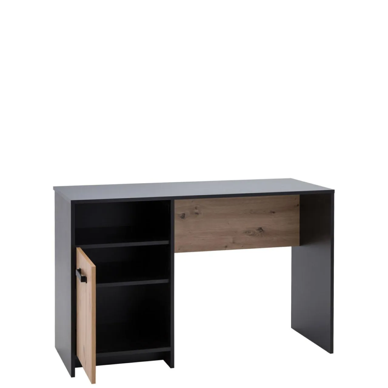 Biurko młodzieżowe STONE II wyróżnia się ciekawym designem i zapewnia wygodną przestrzeń do nauki. Otwarta wnęka i półki za drzwiami pomieszczą książki, pomoce oraz przybory szkolne.