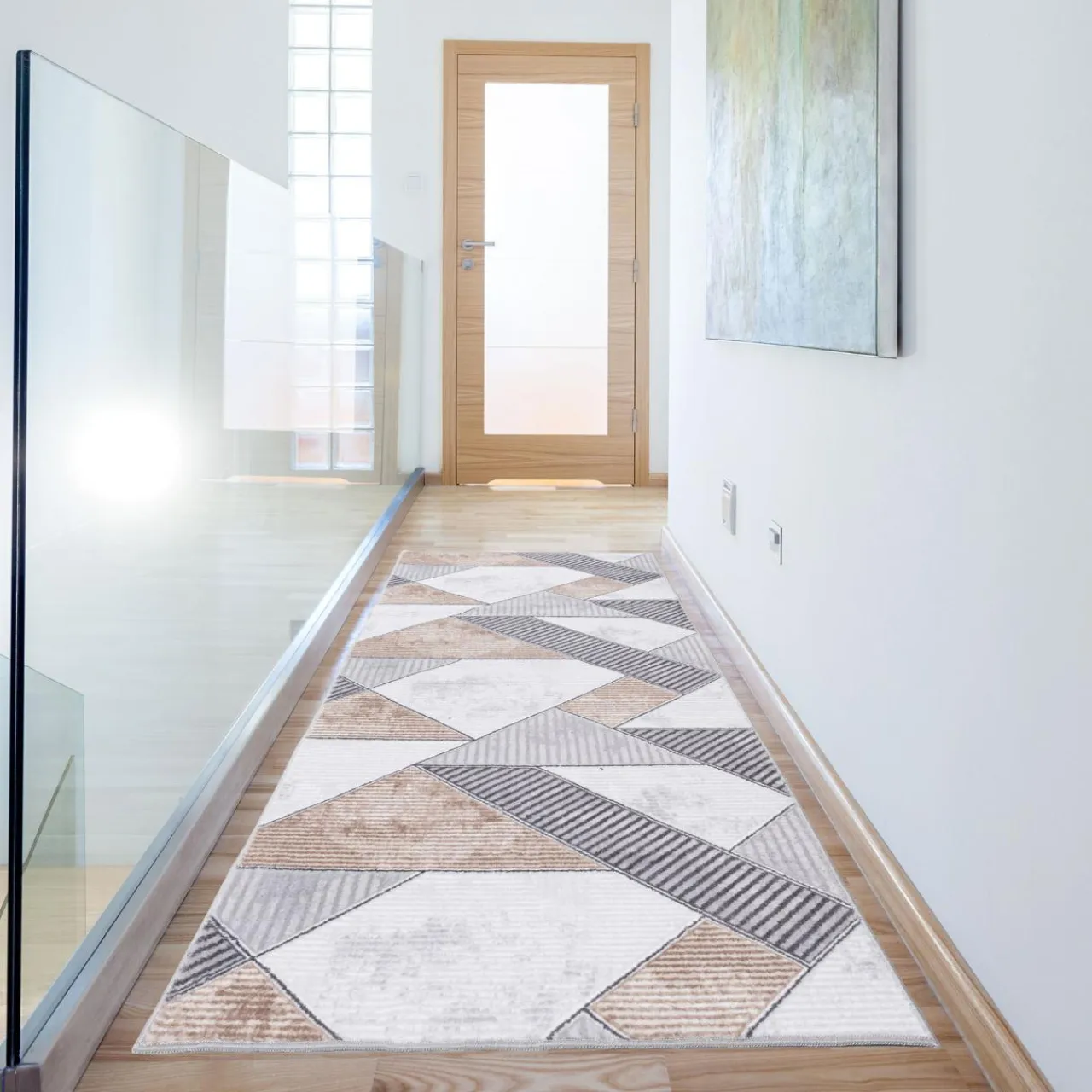 Szukasz pokrycia podłogowego, które sprawdzi się w miejscu często uczęszczanym? Wybierz szaro-beżowy chodnik LONG z geometrycznym wzorem w trójkąty. Nada wnętrzu niepowtarzalny charakter.