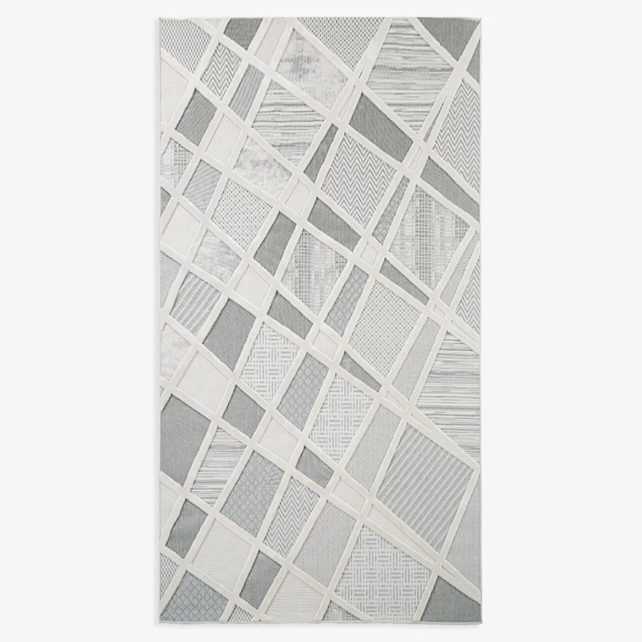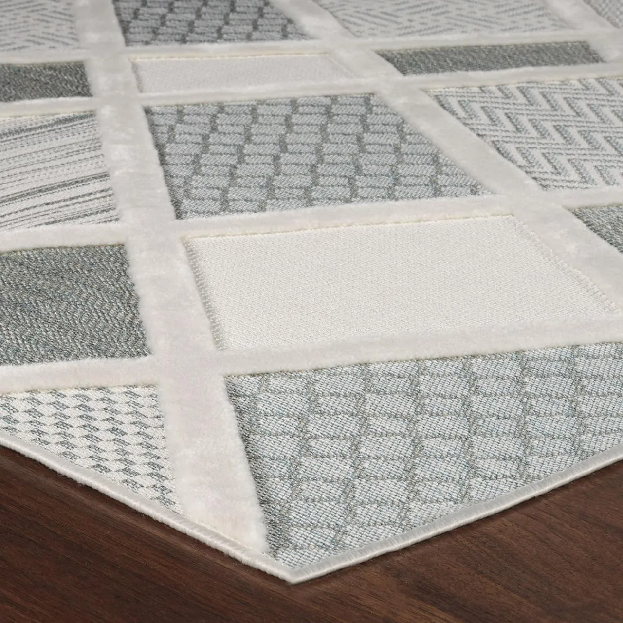 - Dywan utkany jest w technice płaskiego tkania. Wykaże się większą trwałością – posłuży Ci na długo. Puszyste włosie znajduje się tam, gdzie ukośne linie przecinają powierzchnię dywanu, tworząc poletka wypełnione geometrycznym printem.
