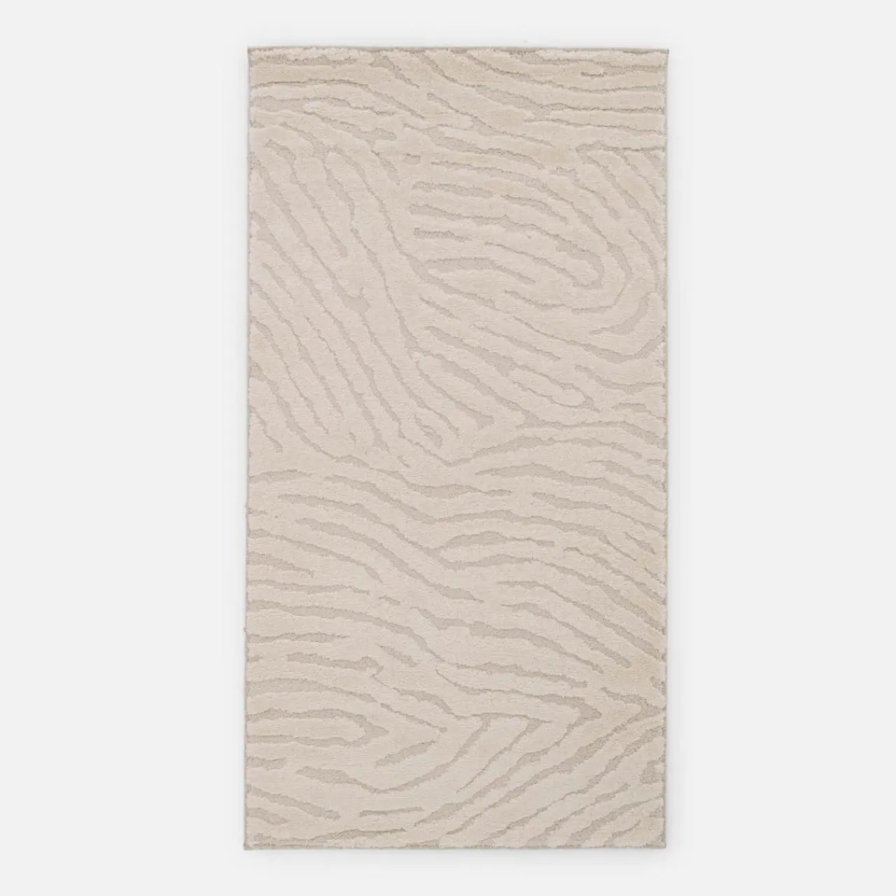 Dywan DEUS wyróżnia subtelny wzór inspirowany naturą – przypomina odcisk palca, fale lub wydmy widziane z lotu ptaka. Taki wzór wprowadza harmonię, uspokaja aranżację, jednocześnie stanowiąc ciekawy akcent we wnętrzu.