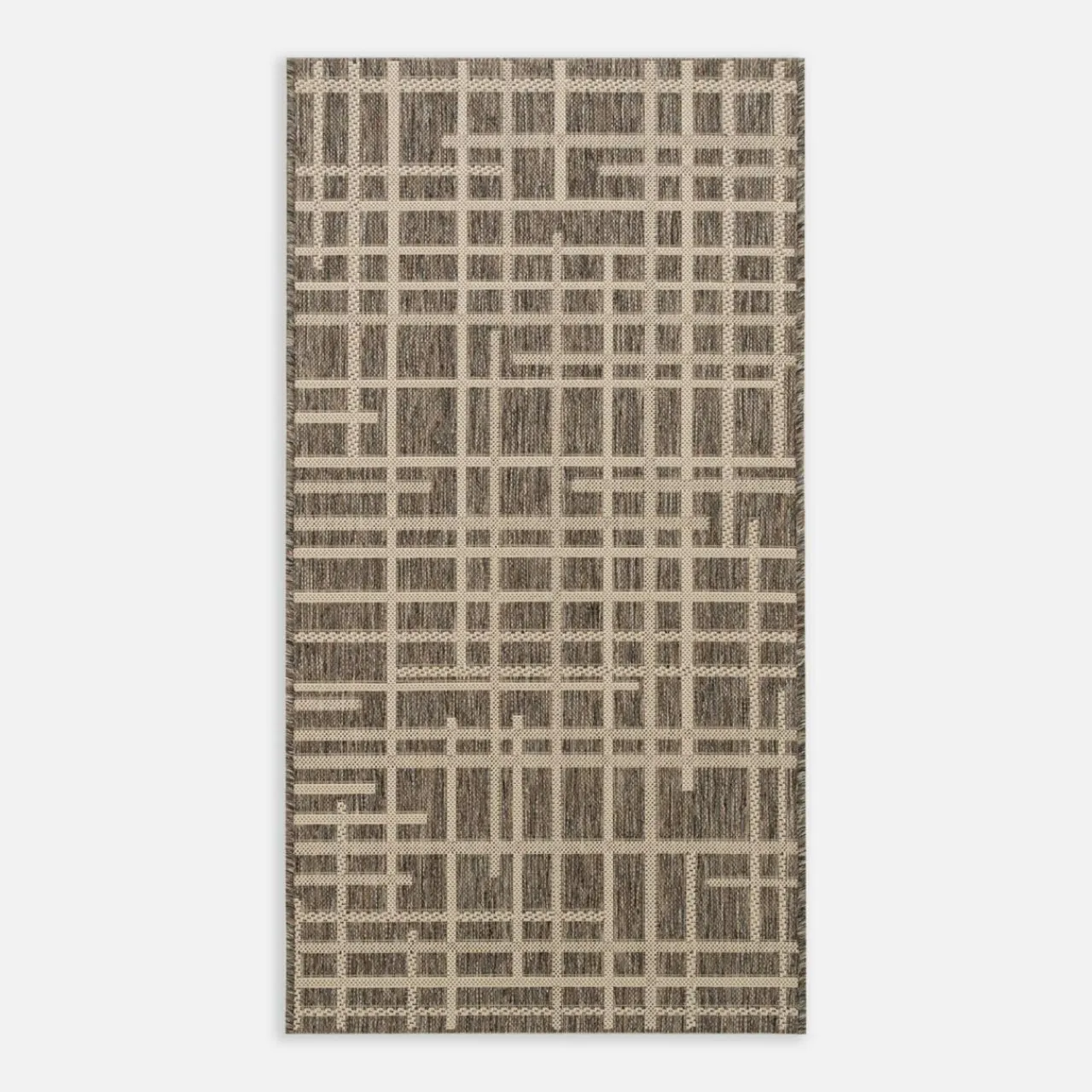 Dywan JUTA to stylowy dodatek, który przyciąga uwagę nowoczesnym wzornictwem. Połączenie ciemnej bazy z jasnymi, przecinającymi się liniami nadaje wnętrzu wyrazistości.