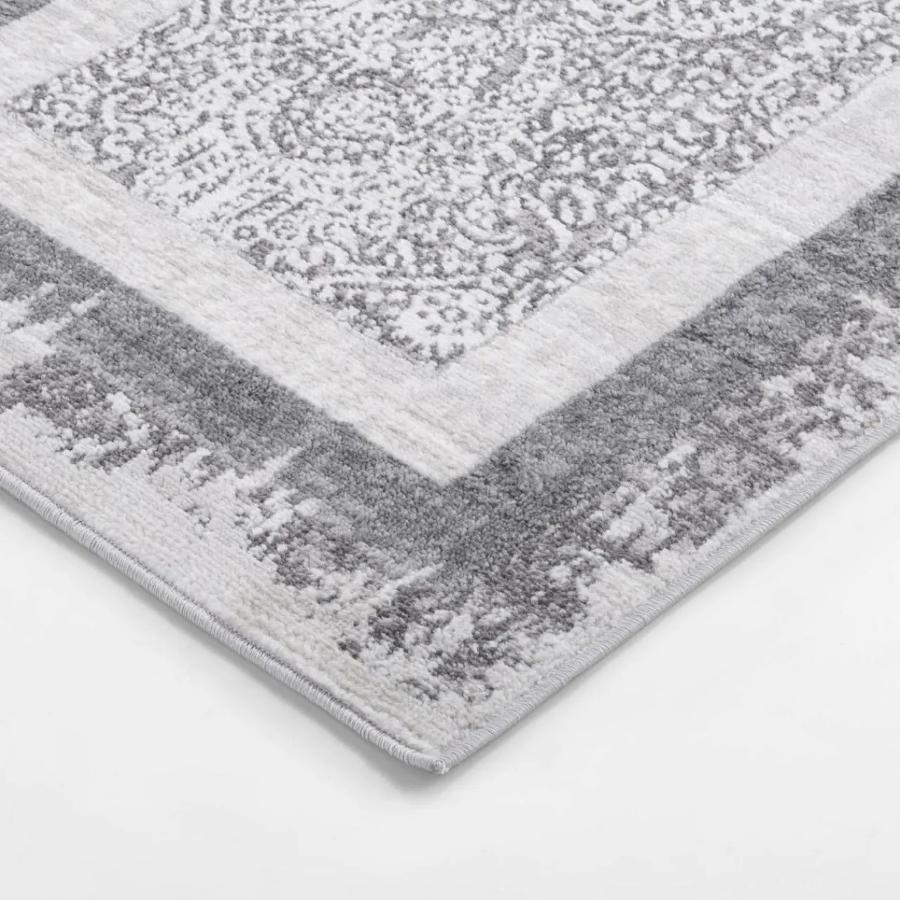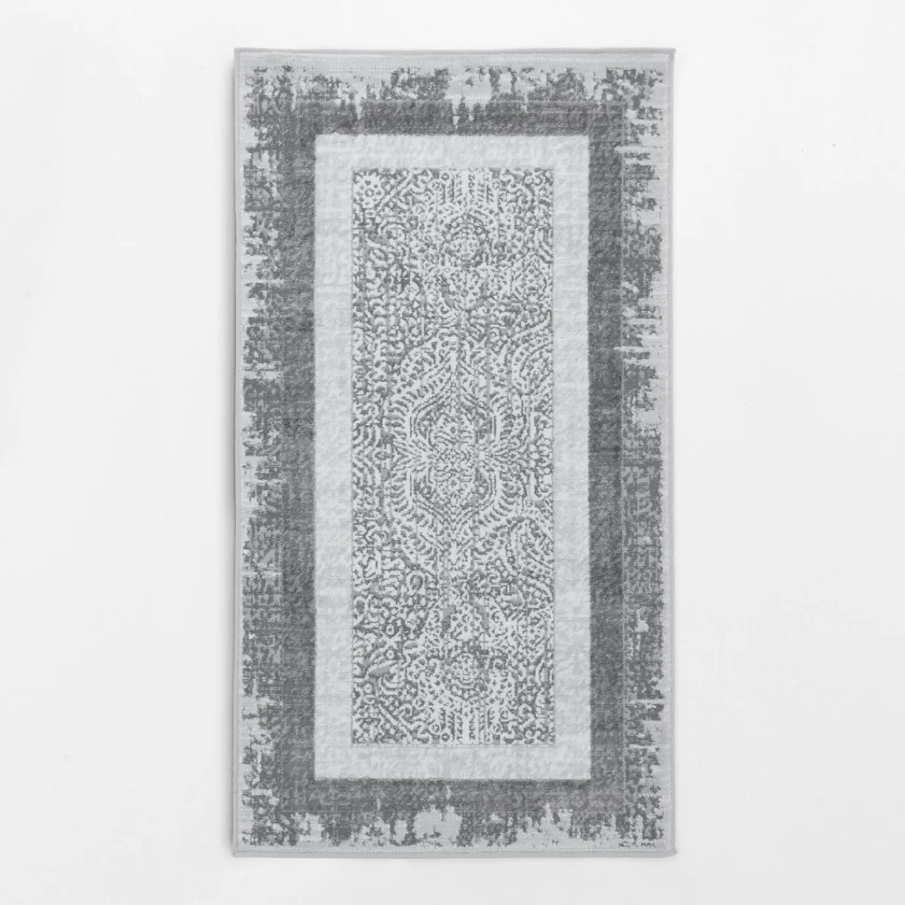 Dywan MIRACLE cechuje elegancki wzór z geometrycznymi ramami i centralnym ornamentem w odcieniach szarości.