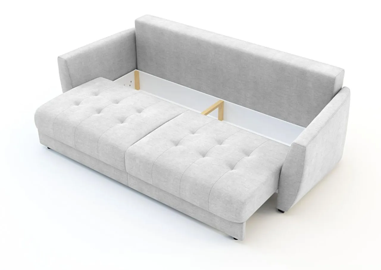 - Zarówno siedzisko i oparcie są skonstruowane ze sprężyn falistych i pianki, dzięki czemu zapewniają nie tylko duży komfort podczas codziennego użytkowania sofy, ale także po rozłożeniu dla okazjonalnego spania;