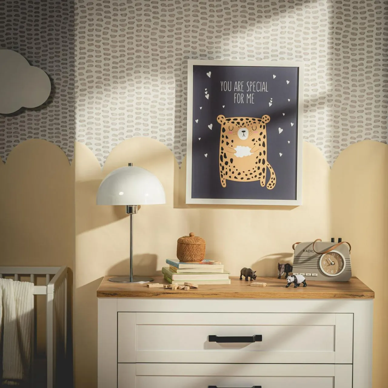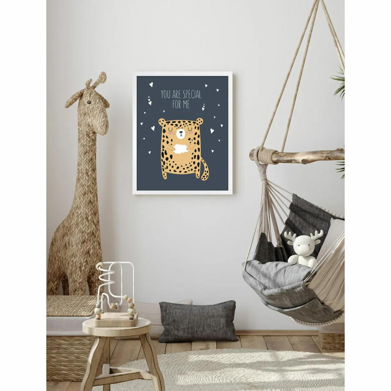 Obraz dla dziecka PANTHER o wymiarach 40×50 cm będzie ładnie wyglądał przy białych meblach i jasnym drewnianym łóżeczku. Możesz go też powiesić nad szafą czy stoliczkiem, przy którym Twoje dziecko lubi się bawić. Obraz ze słodką panterką pomoże stworzyć przytulną atmosferę.