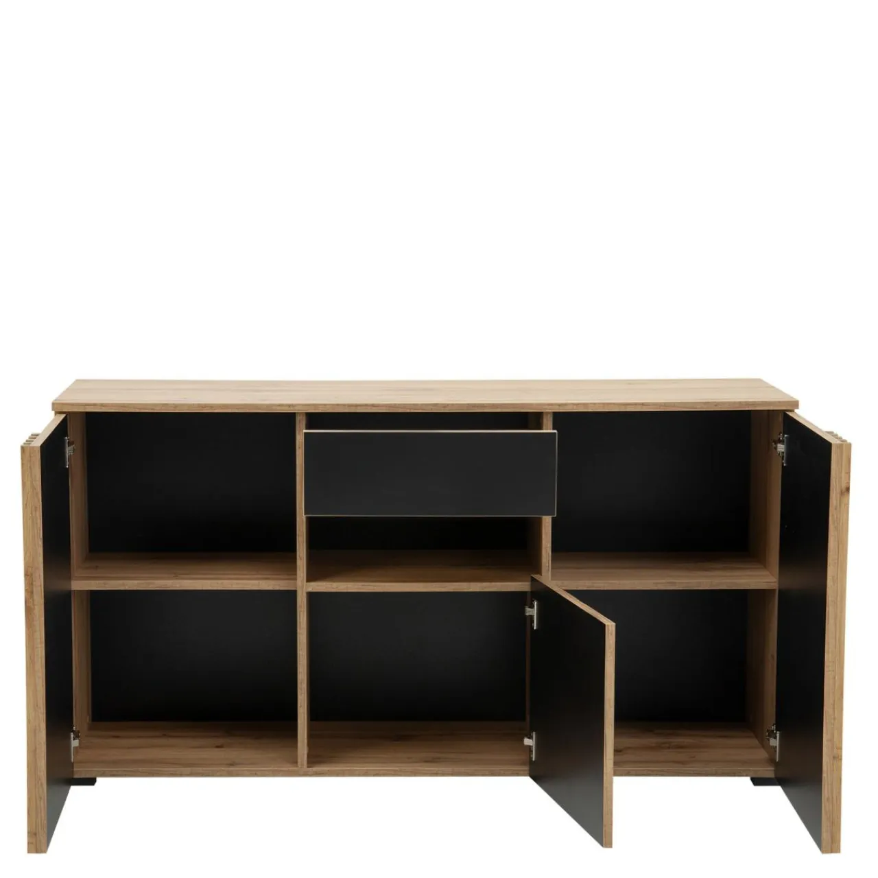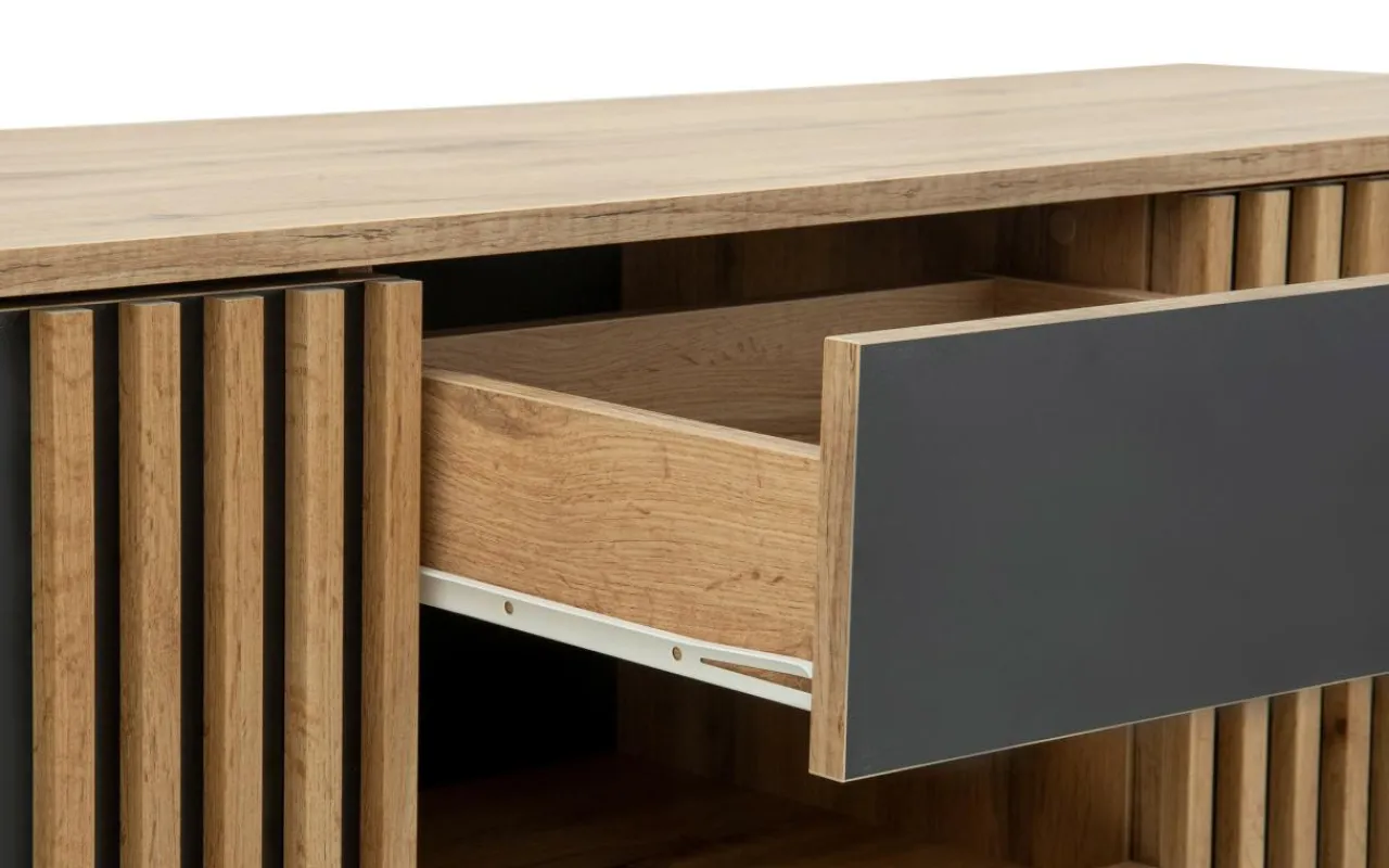 - Ciepły kolor dębu wotan, czarne, minimalistyczne fronty bez uchwytów i ozdobne lamele – całość prezentuje się elegancko i sprawi, że Twój salon wypełni współczesny design.