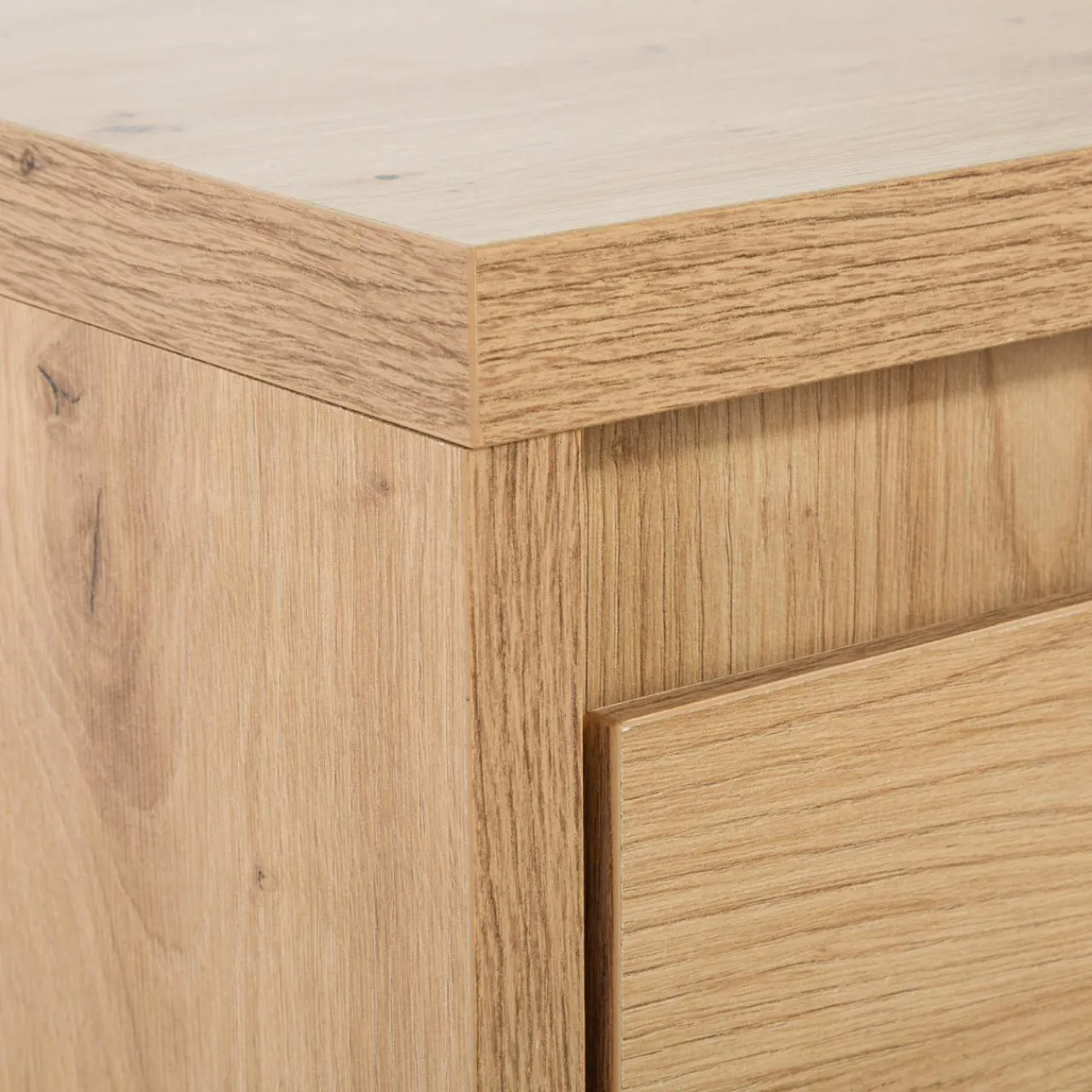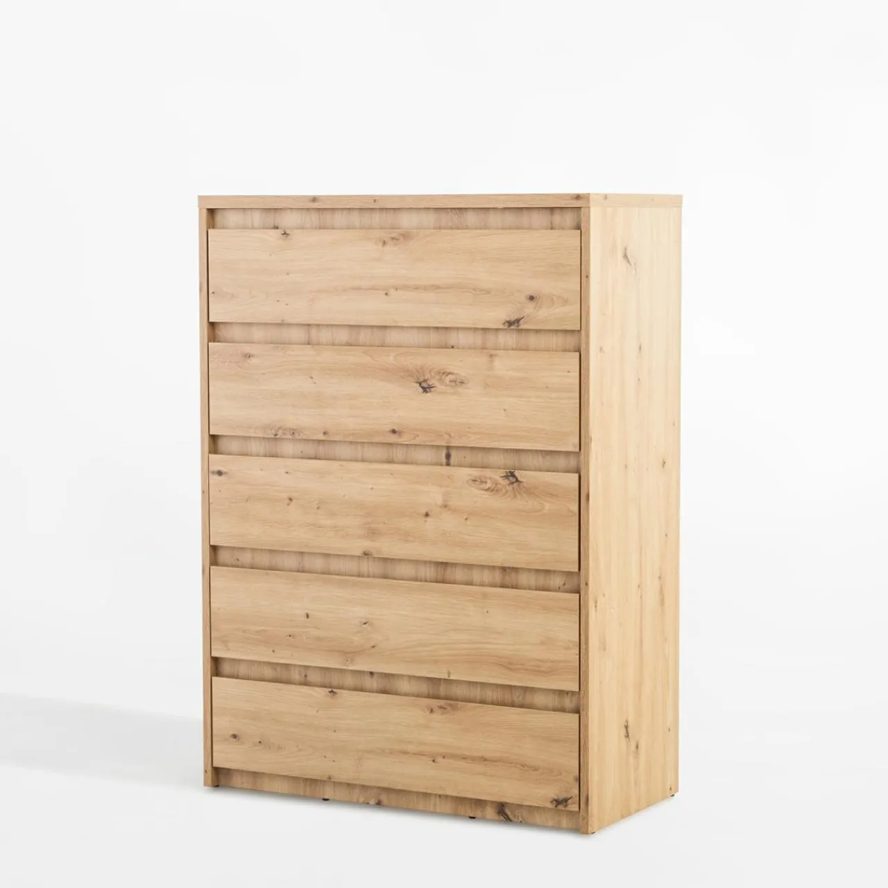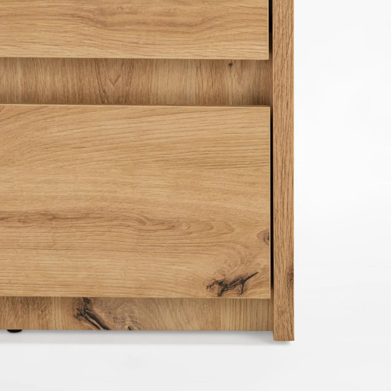 - Komoda wykonana jest z laminowanej płyty meblowej o grubości 1.8 cm w kolorze dąb artisan.