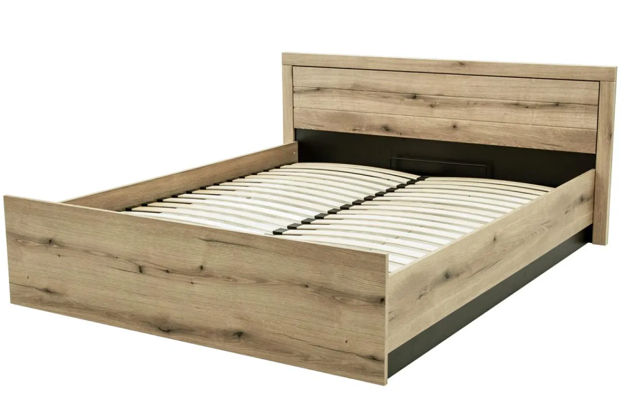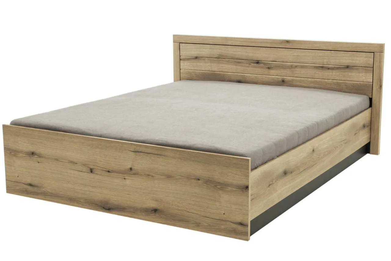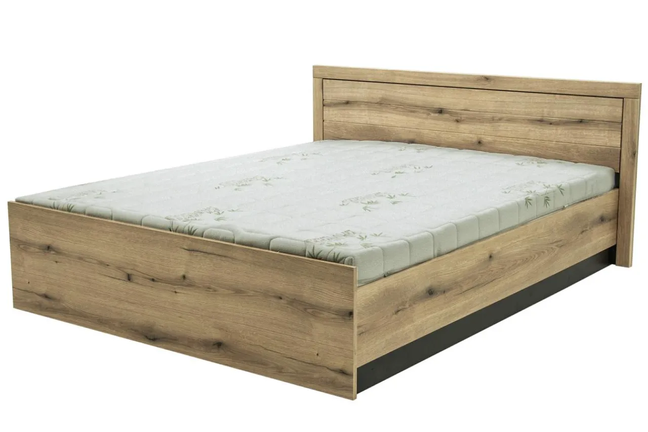 - Rama i wezgłowie wykończone są laminatem oraz folią w kolorze przybrzeżnego dębu o jasnej, sękatej barwie drewna.