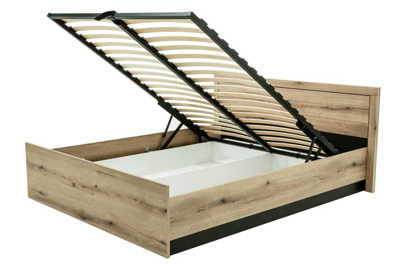 - Stelaż podnoszony o wymiarach 157×194 cm posiada metalową ramę i żebra wykonane ze sklejki.
