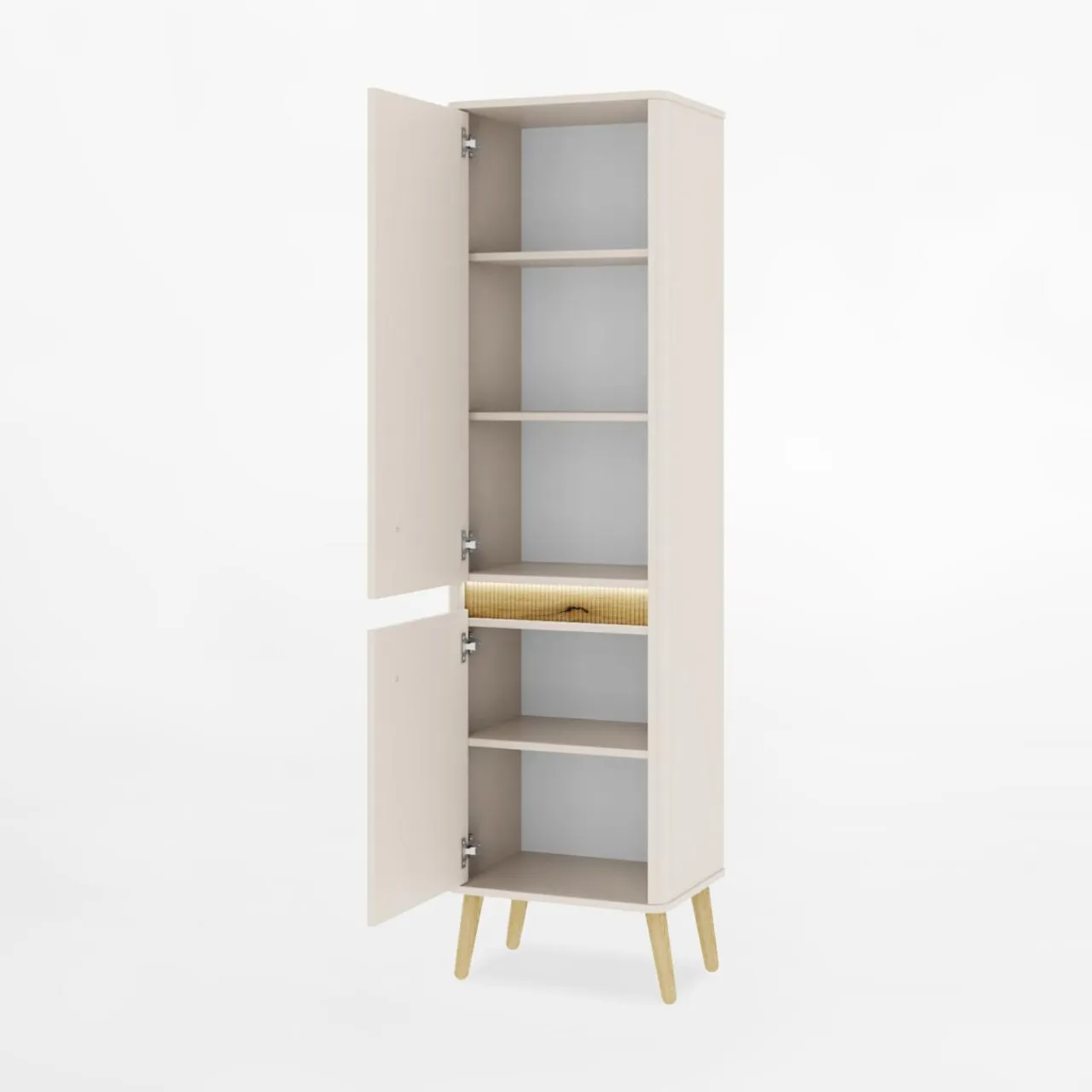 Meble w subtelnym odcieniu kaszmiru połączono z nóżkami w kolorze naturalnego dębu, co wprowadza do wnętrza ciepły i przytulny styl. Doskonale komponuje się zarówno z minimalistycznymi, jak i skandynawskimi aranżacjami, dodając im charakteru.