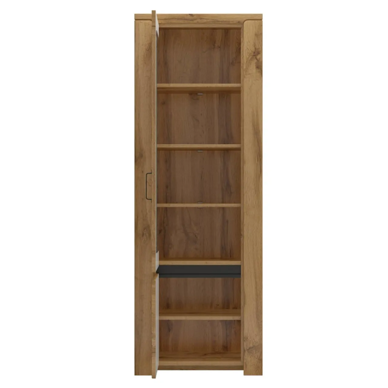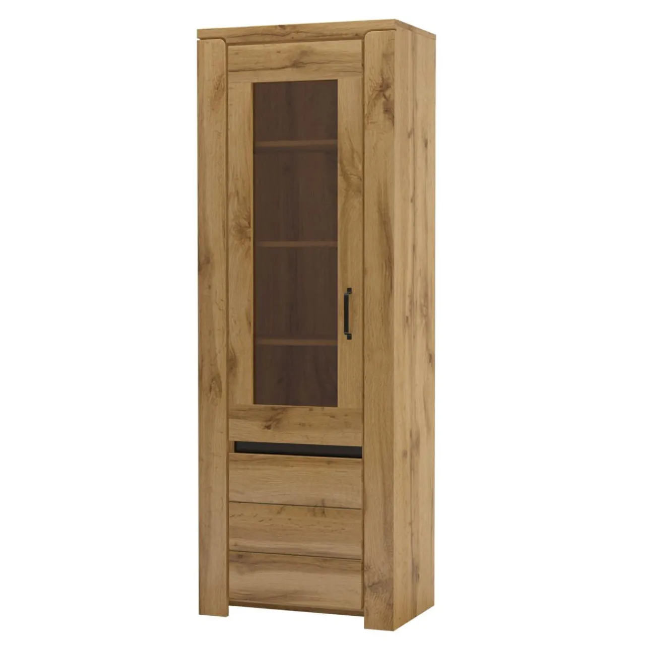 Ciepły odcień drewna, brązowe szyby w drzwiach witryny i oświetlenie LED (opcjonalnie) wprowadzają do wnętrza przytulny klimat. Wraz z pozostałymi meblami z serii, witryna tworzy aranżację o sielskim charakterze.