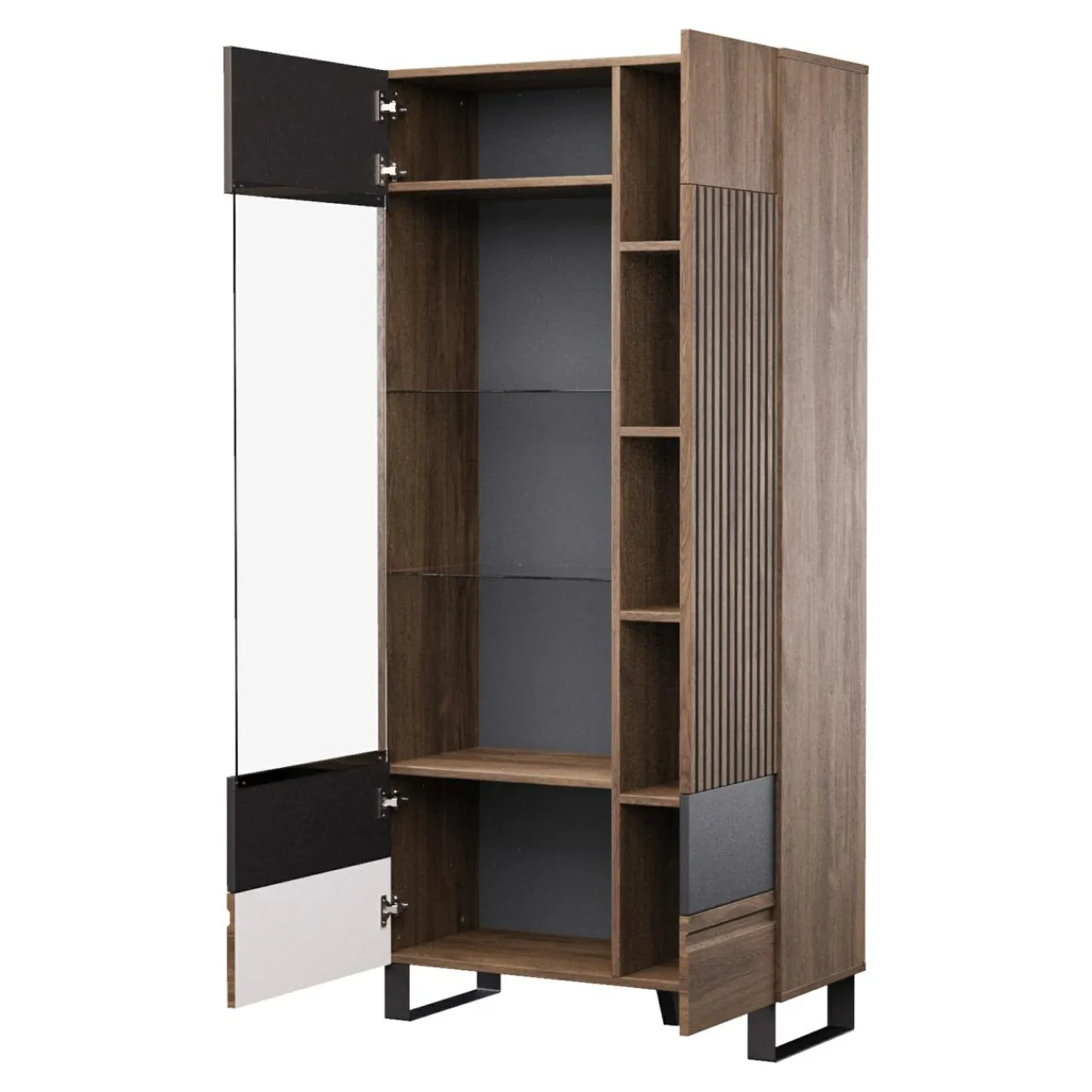 Dzięki zastosowaniu efektu lameli na froncie, witryna BOSTON 2D podkreśla nietuzinkowy wystrój jadalni lub pokoju dziennego. Szerokość witryny (92 cm) sprawia, że łatwo dopasujesz ją nawet do niewielkiego pomieszczenia.