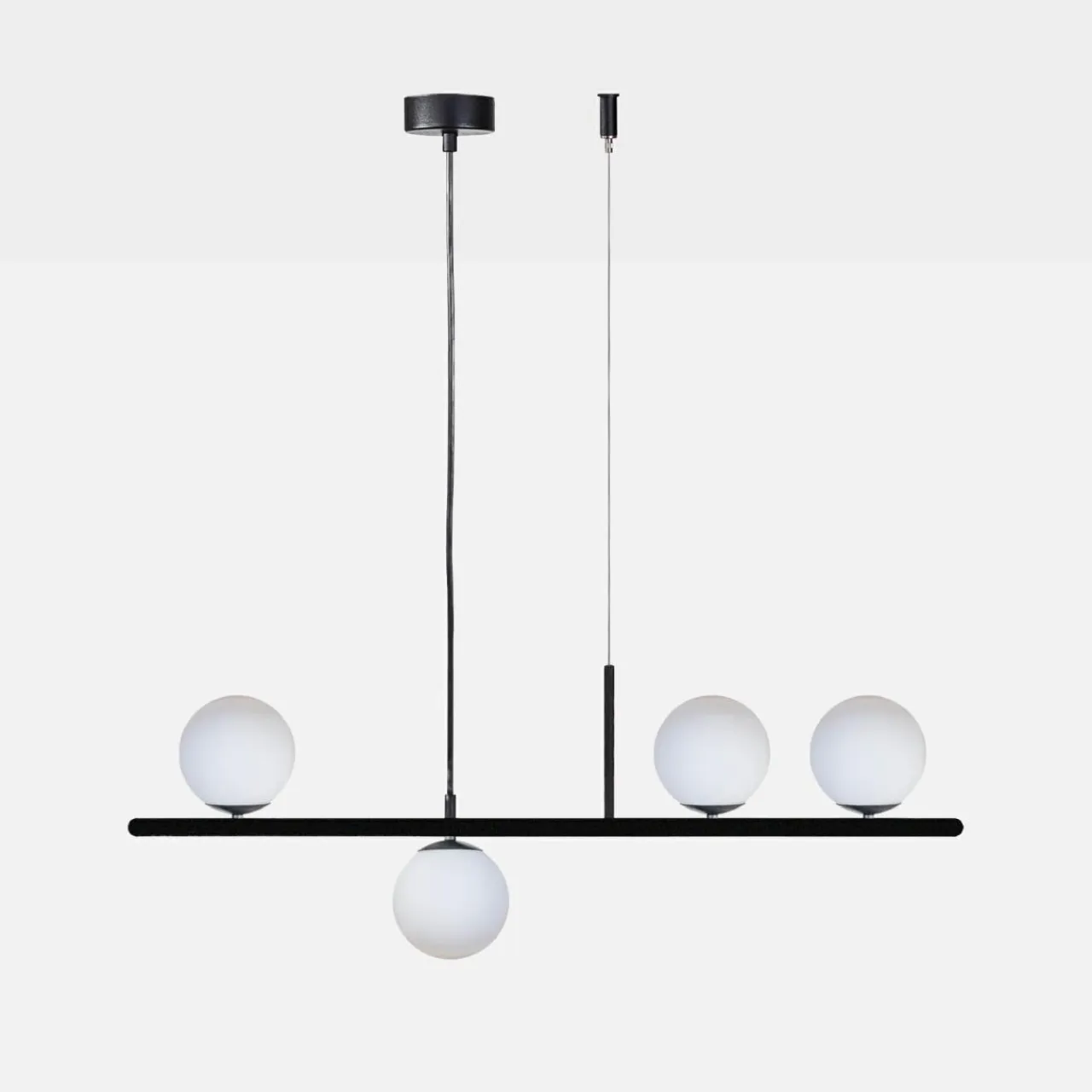 - Kolorystyka w matowej czerni kontrastuje z mlecznobiałymi kloszami, wprowadzając wrażenie pozornej surowości. Jej design sprawia, że możesz dopasować do wnętrz nowoczesnych i minimalistycznych.