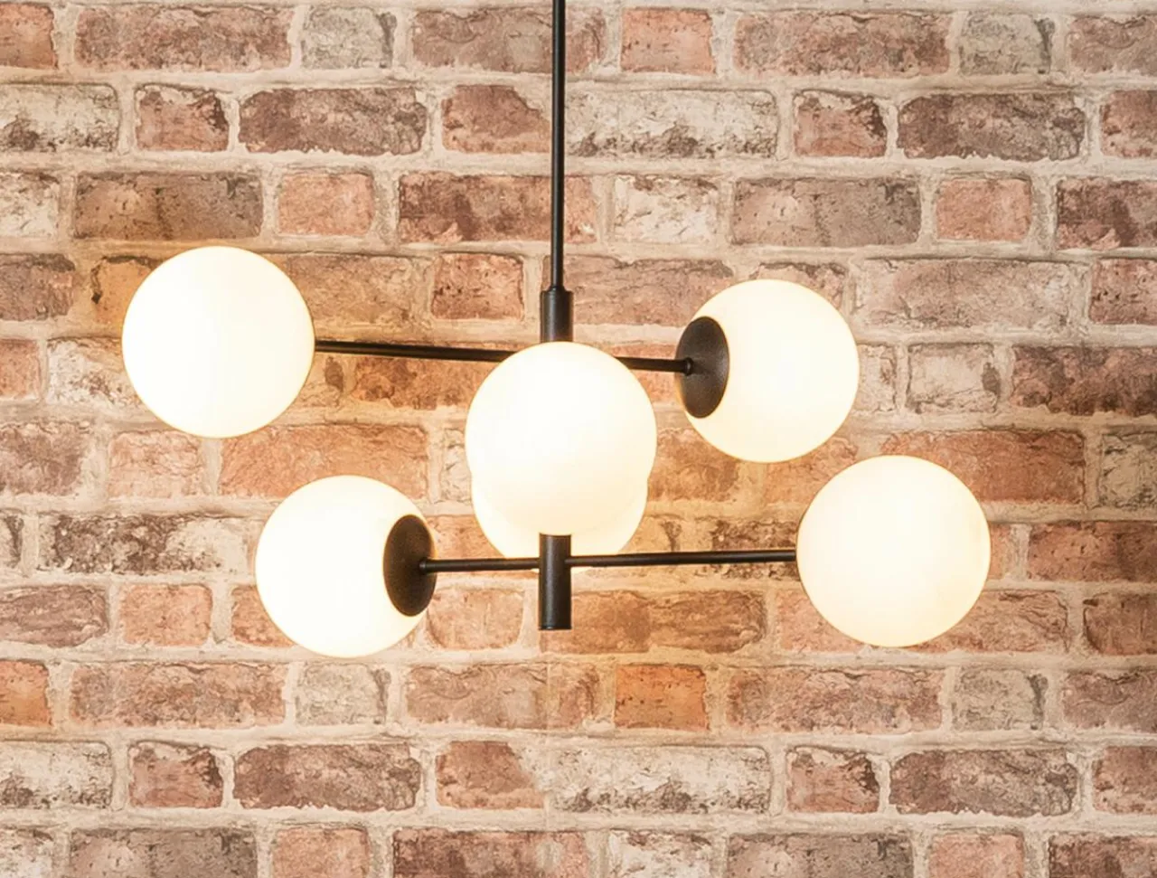 Klosze, które wieńczą lampę są połączone w przejrzysty sposób za pomocą prostopadle połączonych ramion. Mlecznobiałe kule całkowicie osłaniają żarówki, a wykończenie bazy w czarnym kolorze nadaje całości minimalistycznego posmaku i doskonale koresponduje z meblami w odcieniach szarości, czerni i bieli.