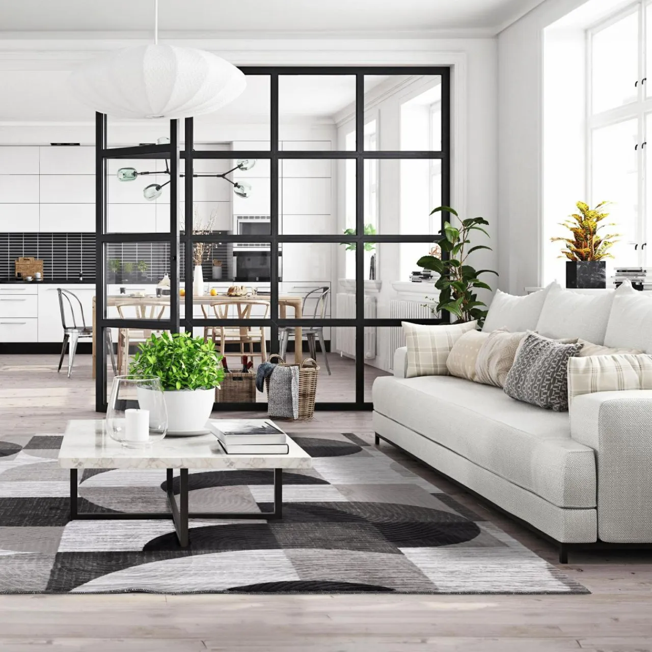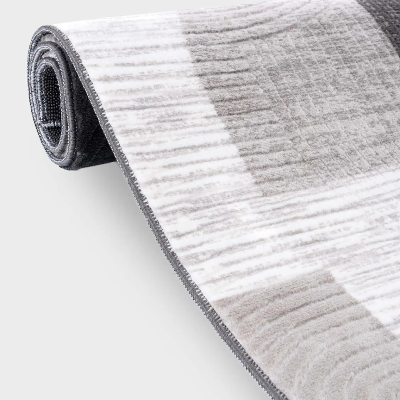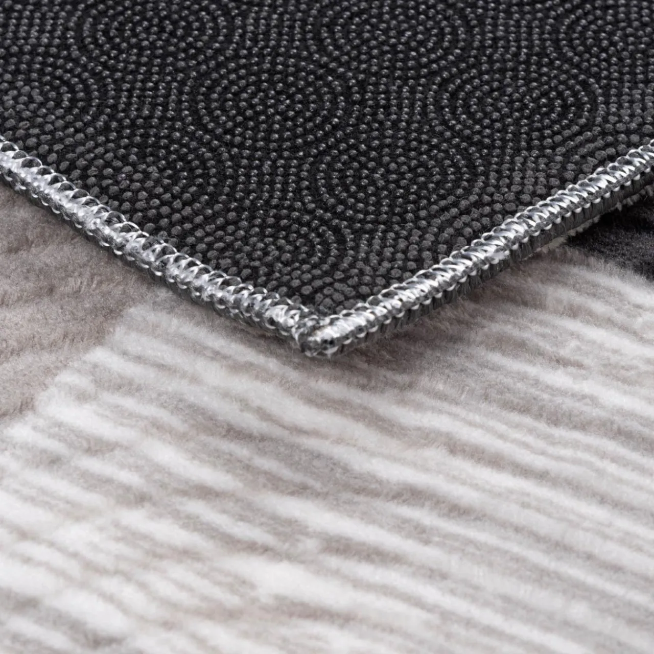Runo dywanu oprócz rysunku charakteryzują tłoczenia w miękkim włosiu, dzięki czemu zyskuje on ciekawą teksturę i efekt trójwymiarowości. Kontrastująca biel, czerń i odcienie szarości dodadzą wnętrzu nowoczesnej estetyki.