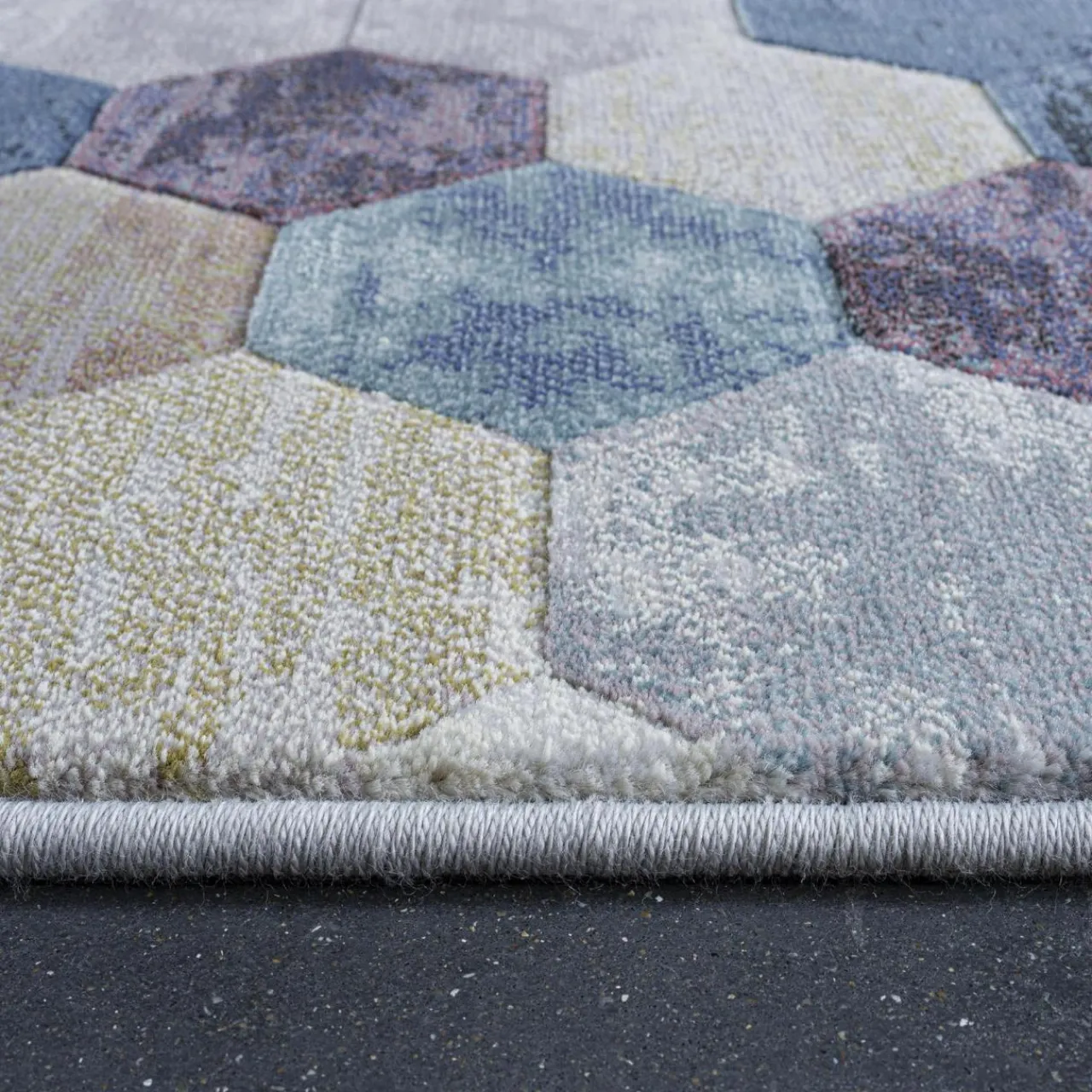 Sześciokąty tworzą wzór przypominający plaster miodu mieniący się paletą barw: od niebieskawych, poprzez malinowe aż po pomarańcz.