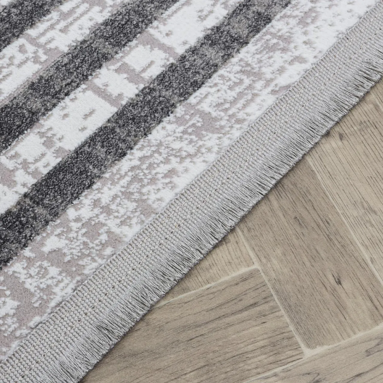 - Dywan ma jasnoszary kolor, a zdobią go antracytowe pasy.