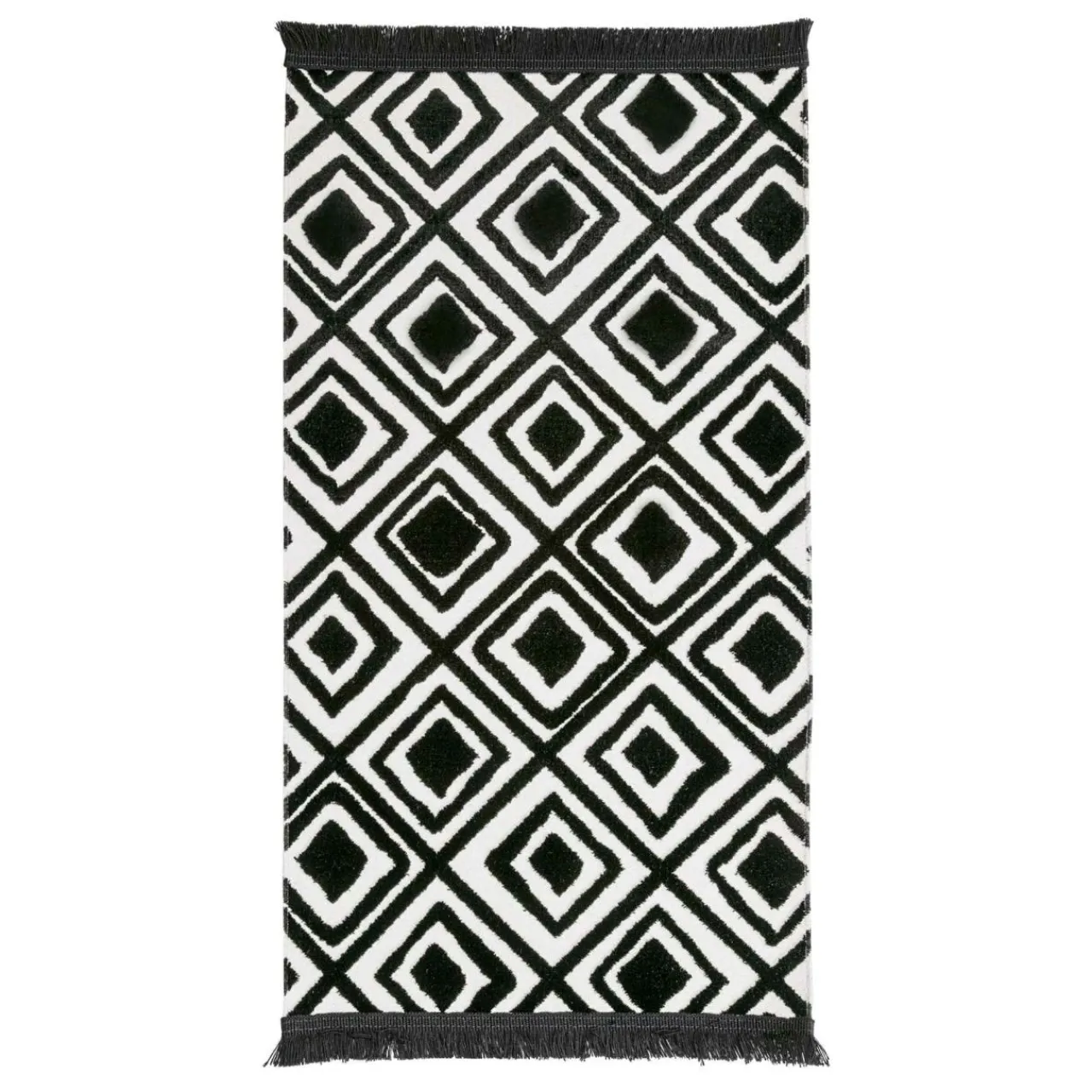 Dywanik wykończono taśmą z frędzlami, więc estetycznie wpasuje się we wnętrza w stylu boho i etno.