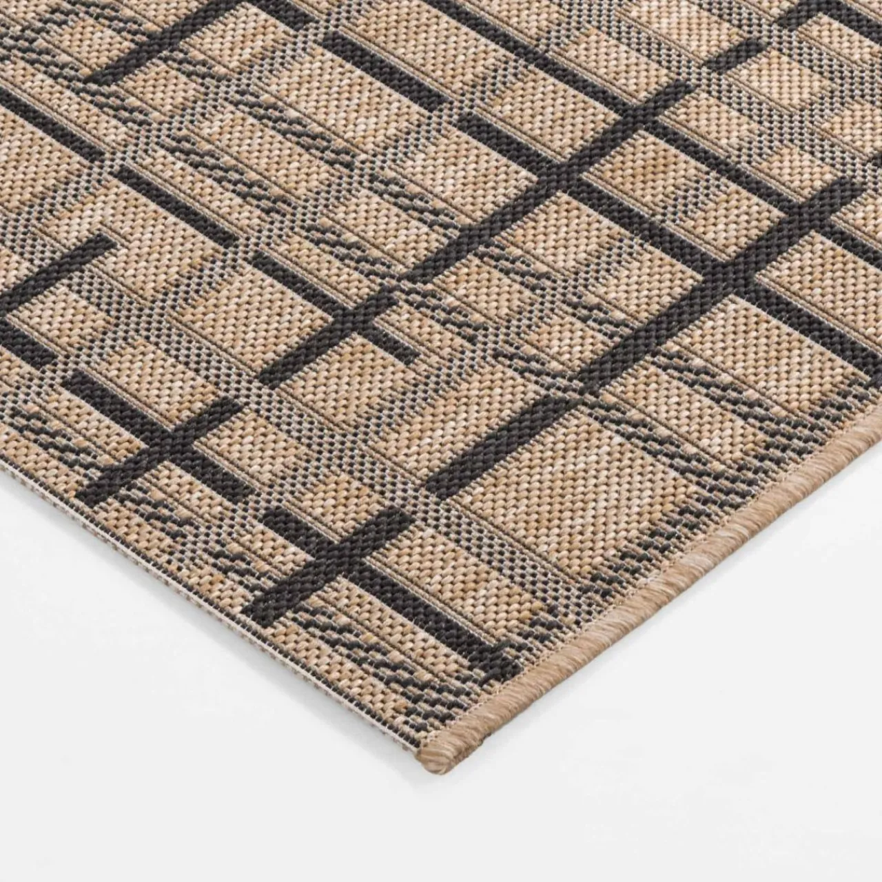 Dywan JUTA to stylowy dodatek, który przyciąga uwagę nowoczesnym wzornictwem. Połączenie ciemnej bazy z jasnymi, przecinającymi się liniami nadaje wnętrzu wyrazistości.