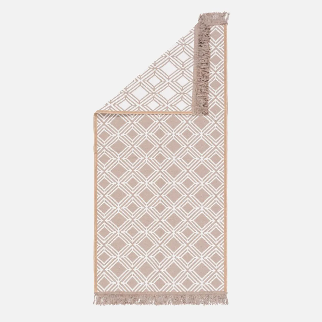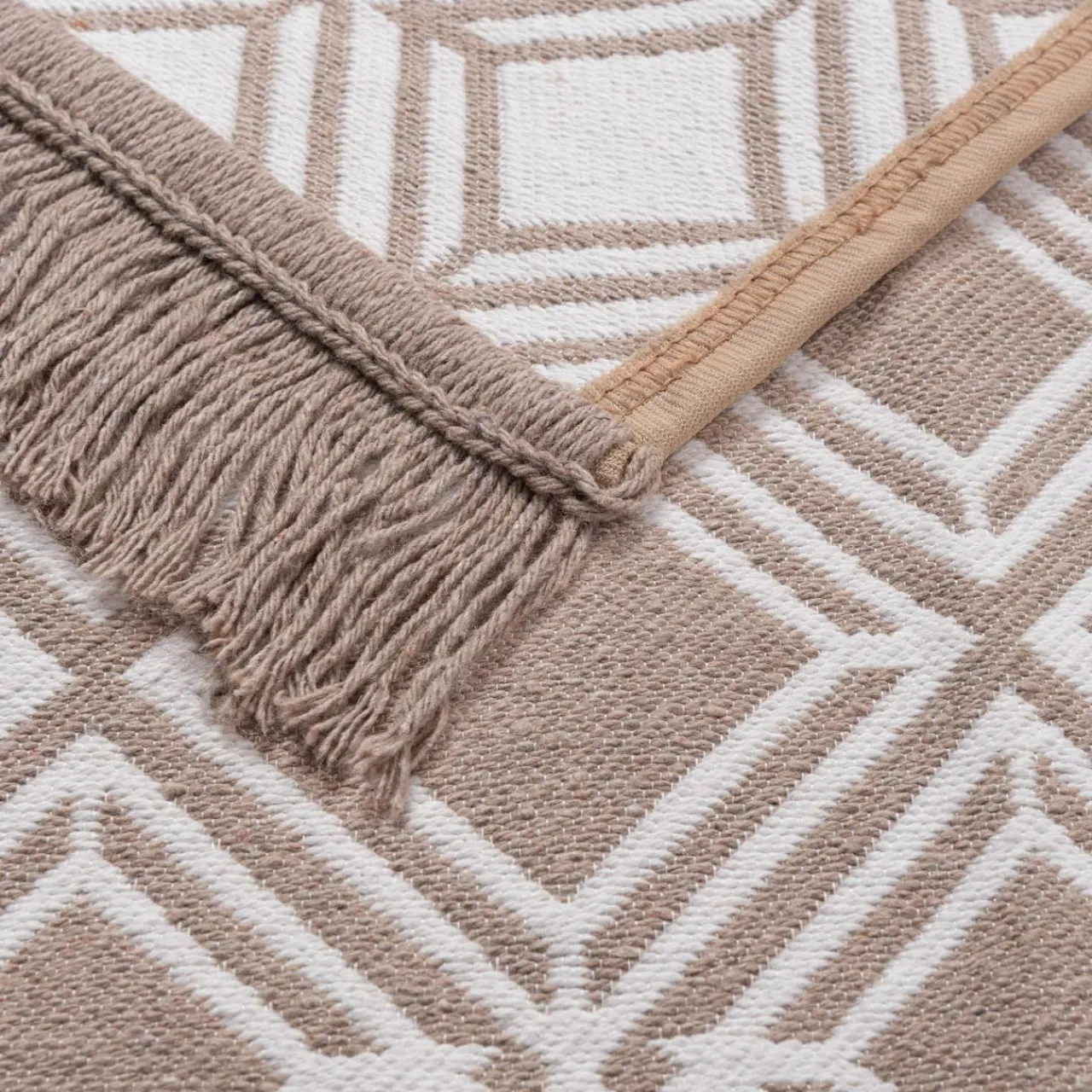 Dywan ALBORG łączy w sobie łagodne beżowe i brązowe odcienie, dlatego świetnie sprawdzi się w boho, japandi i nowoczesnych wnętrzach o jasnym wystroju. Geometryczny wzór przełamie monotonię aranżacji.