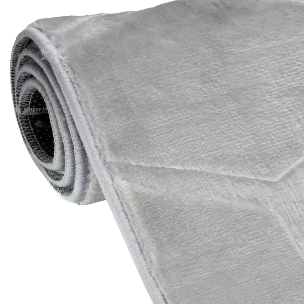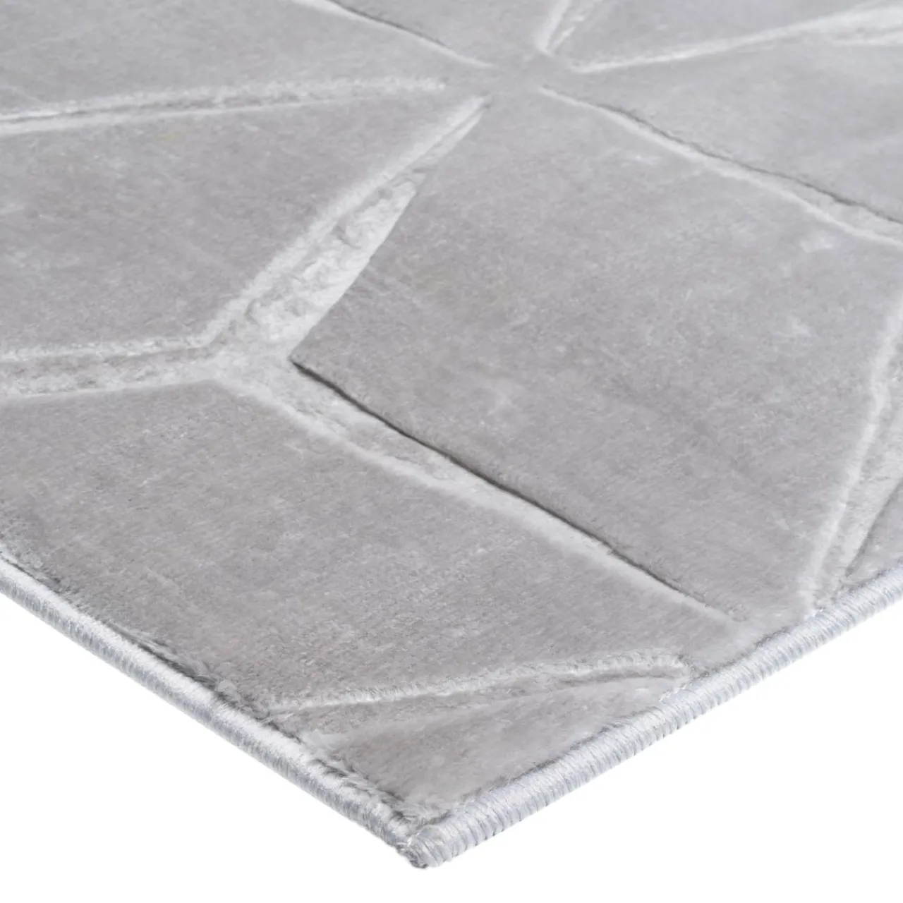 - Runo dywanu jest dwupoziomowe, dzięki temu powstaje ciekawy efekt 3 D. Geometryczny wzór jest wytłoczony w welurze. Światło będzie załamywało się na jego powierzchni w intrygujący sposób.