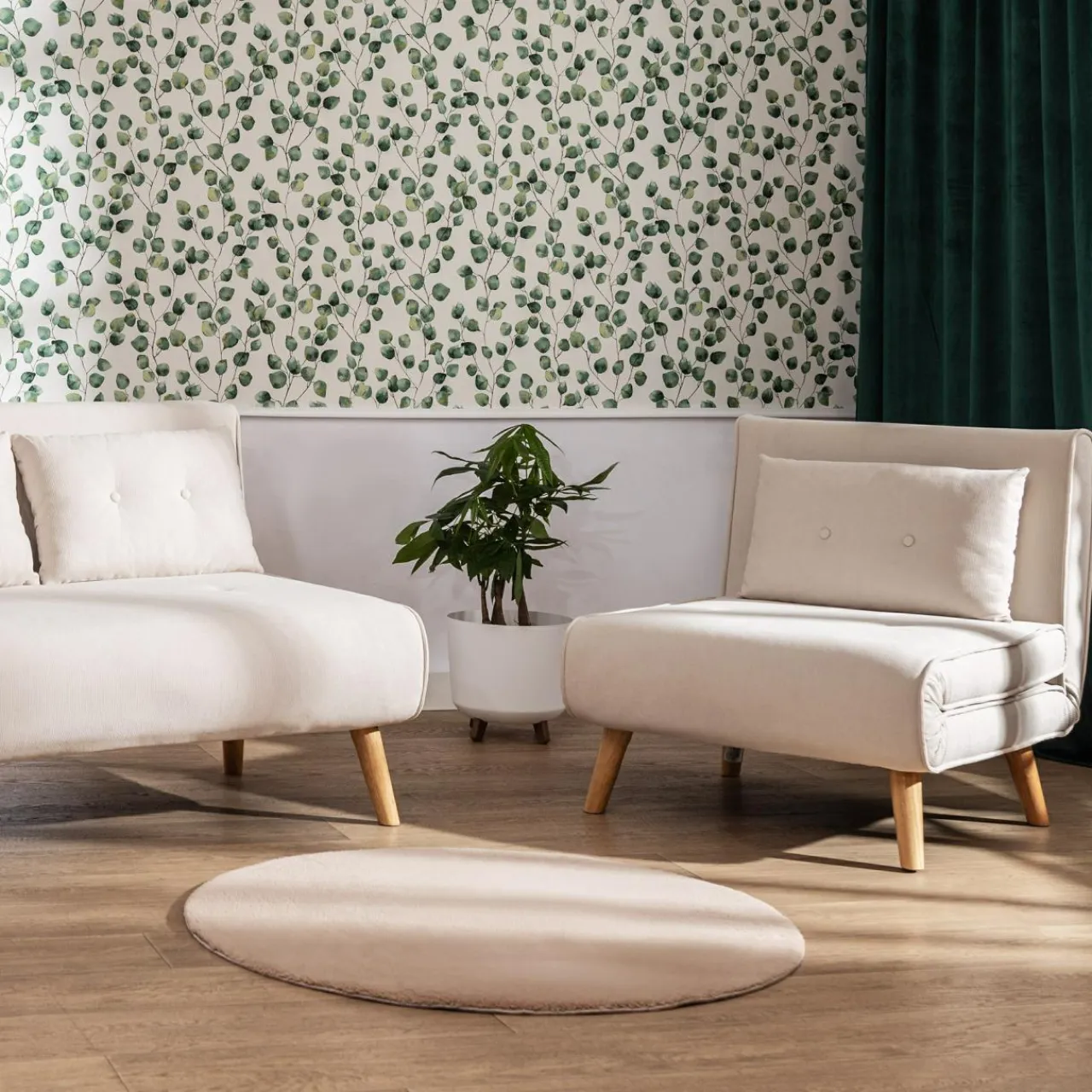 - Okrągły kształt dywanu RABBII podkreśli wystrój, w którym króluje geometria. Podkreśli uporządkowaną przestrzeń.