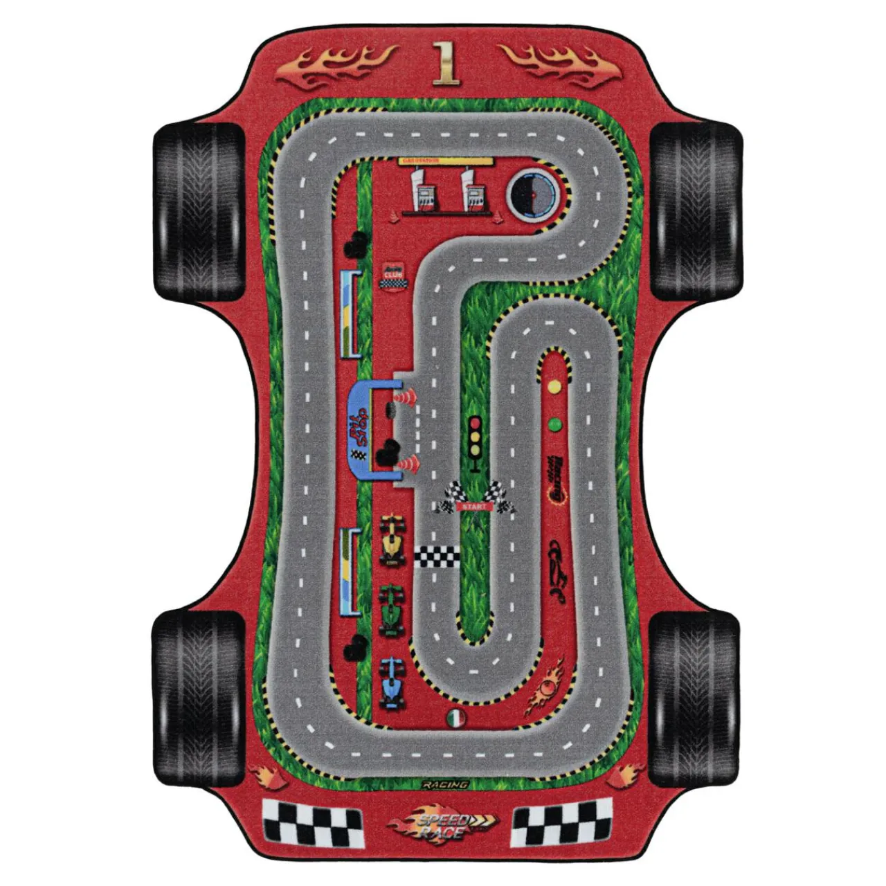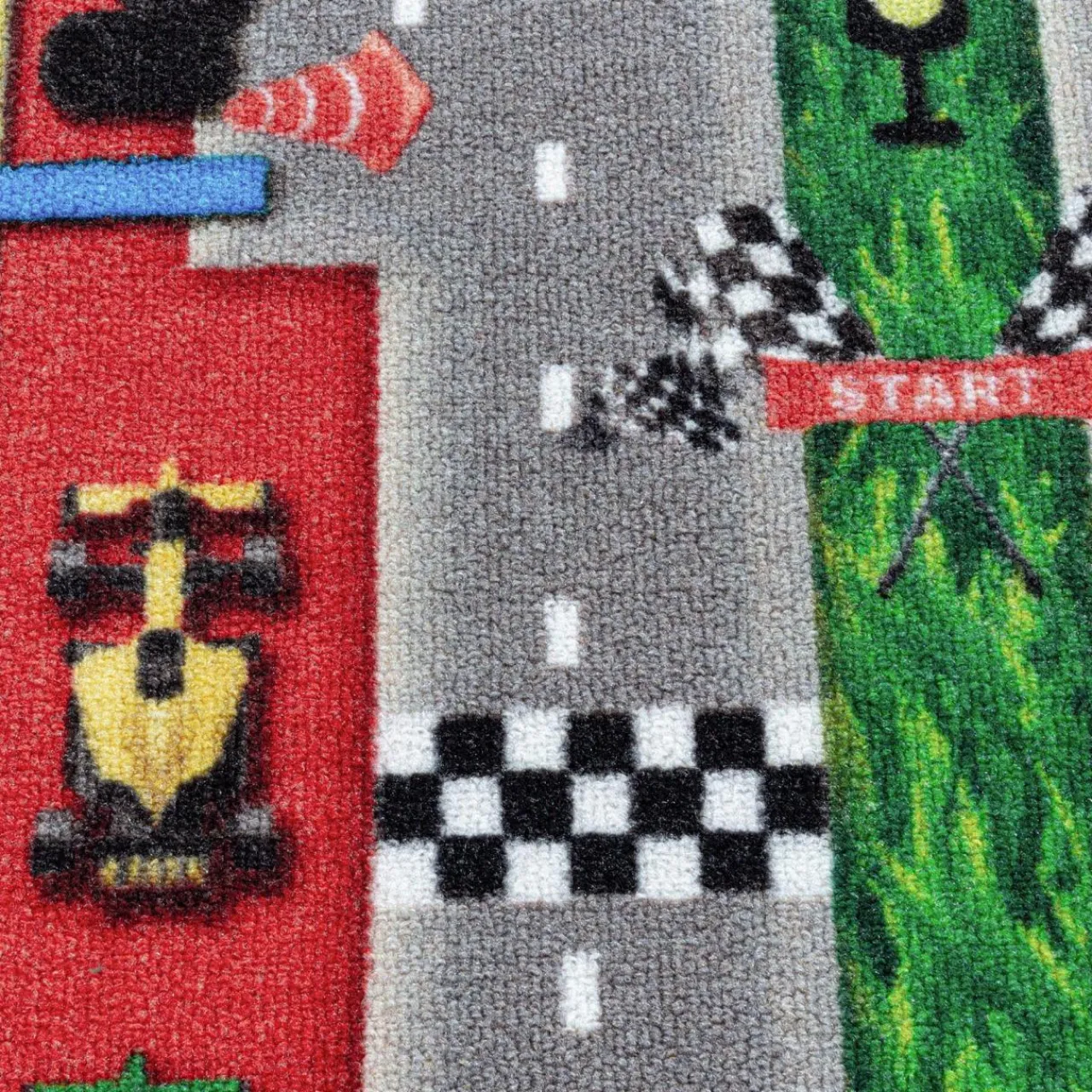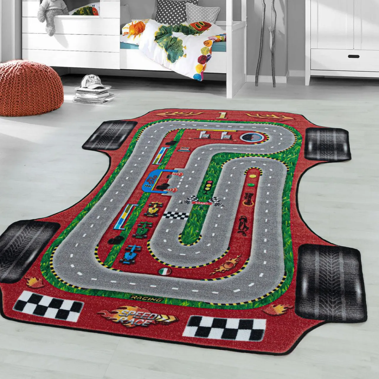 Dywan ma wzór z torem wyścigowym, po którym można jeździć resorakami. Zainspiruje do zabawy i ochroni dziecko przed chłodem podłogi.