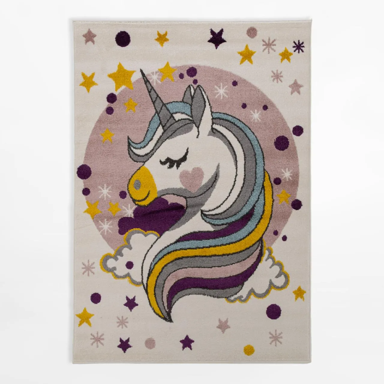 Urządzacie pokój dla dziecka? A może chcesz wprowadzić bajkową atmosferę do swojego pokoju? Dywan HAPPY ze wzorem jednorożca nada wnętrzu przytulnego klimatu.