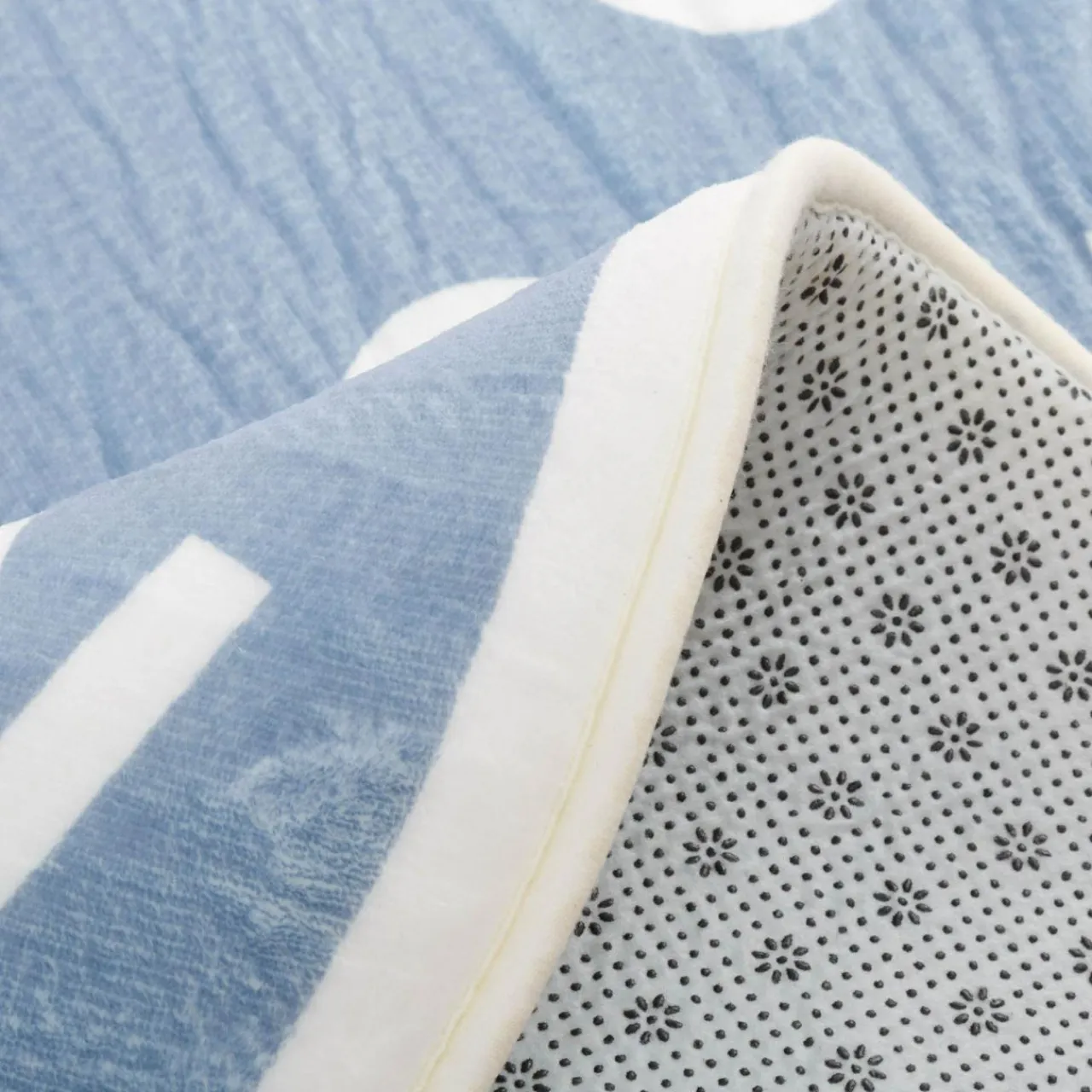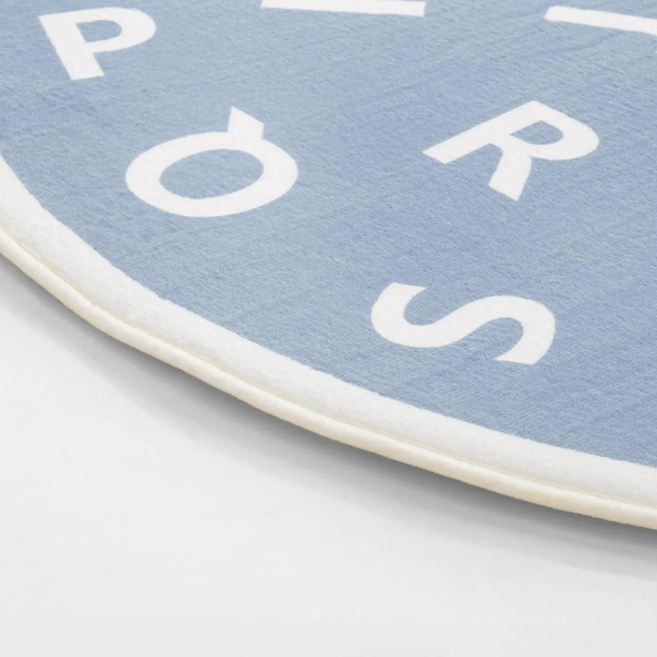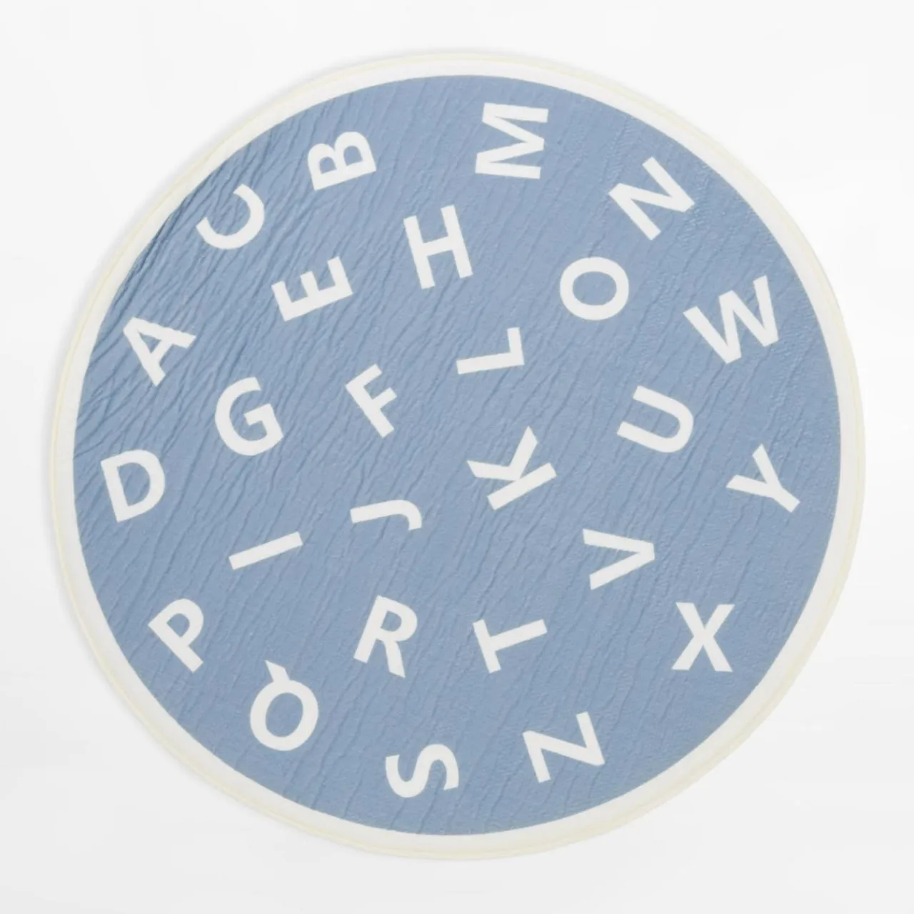 Okrągły dywan ze wzorem w literki to wyjątkowa dekoracja do pokoju dziecięcego. Rozrzucone na jasnoniebieskim dywanie litery pobudzają kreatywność i pomogą poćwiczyć alfabet.