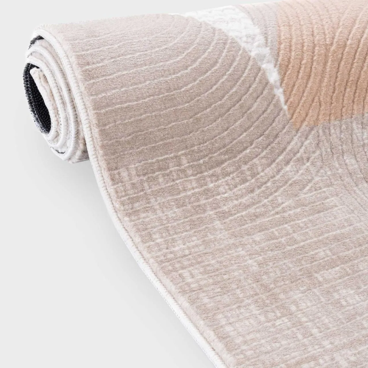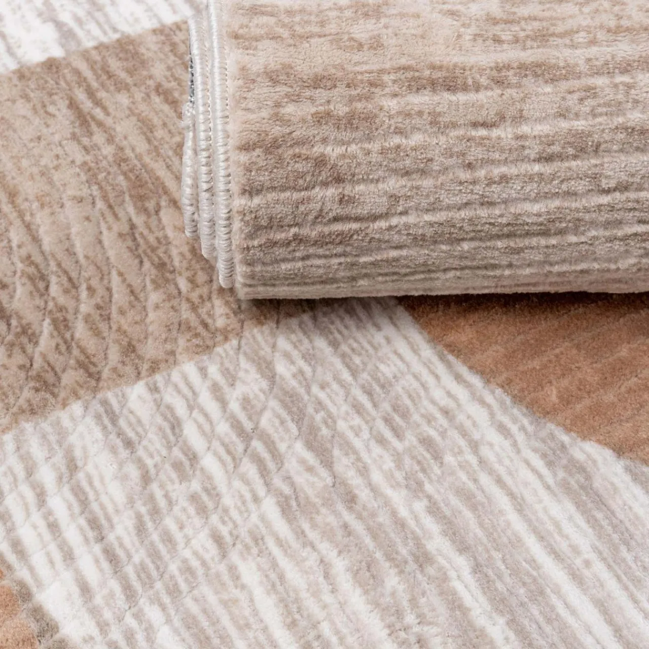 Runo dywanu oprócz rysunku charakteryzują tłoczenia w miękkim włosiu, dzięki czemu zyskuje on ciekawą teksturę i efekt trójwymiarowości. Ciepłe odcienie beżów i brązów dodadzą wnętrzu nowoczesnej estetyki.