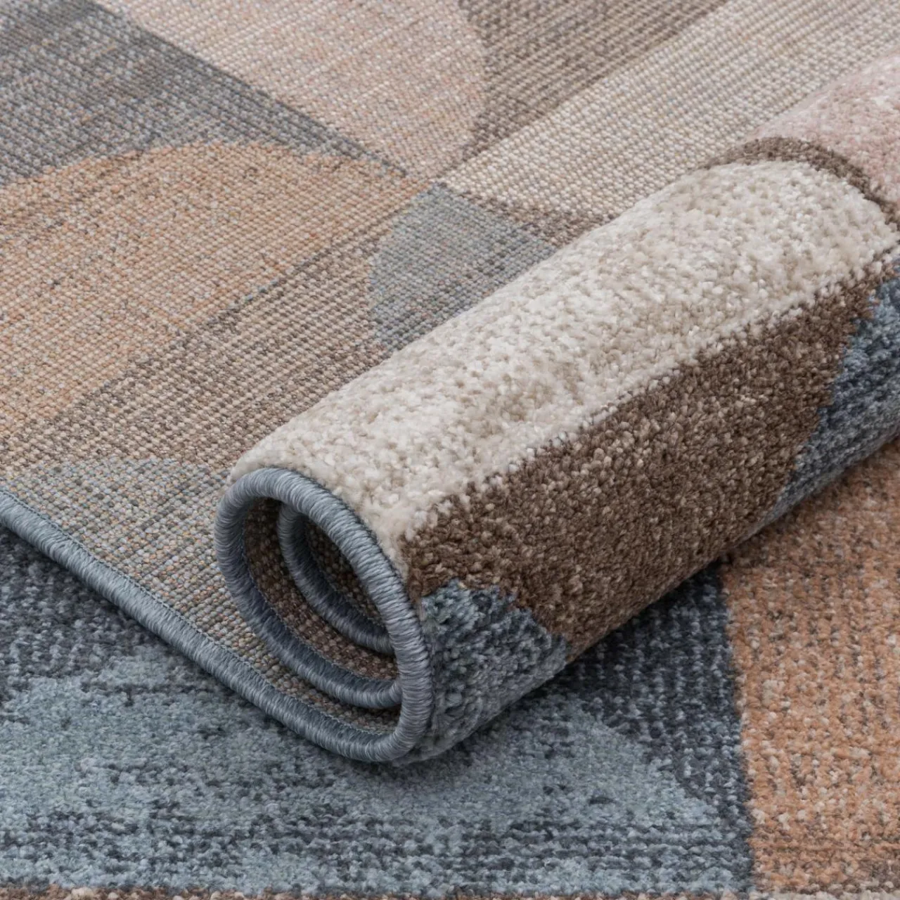 - Dynamiczny wzór geometryczny wykorzystuje odcienie niebieskiego, pomarańczowego, beżu i różu.