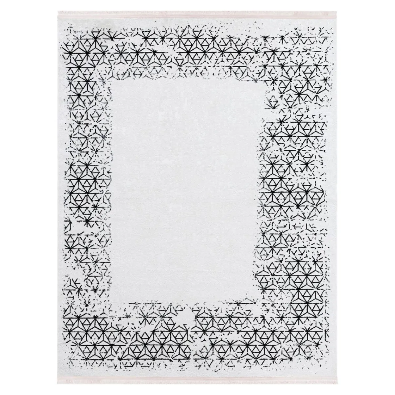 - Biały dywan zdobi nieregularna, geometryczna rama w nowoczesnym stylu.