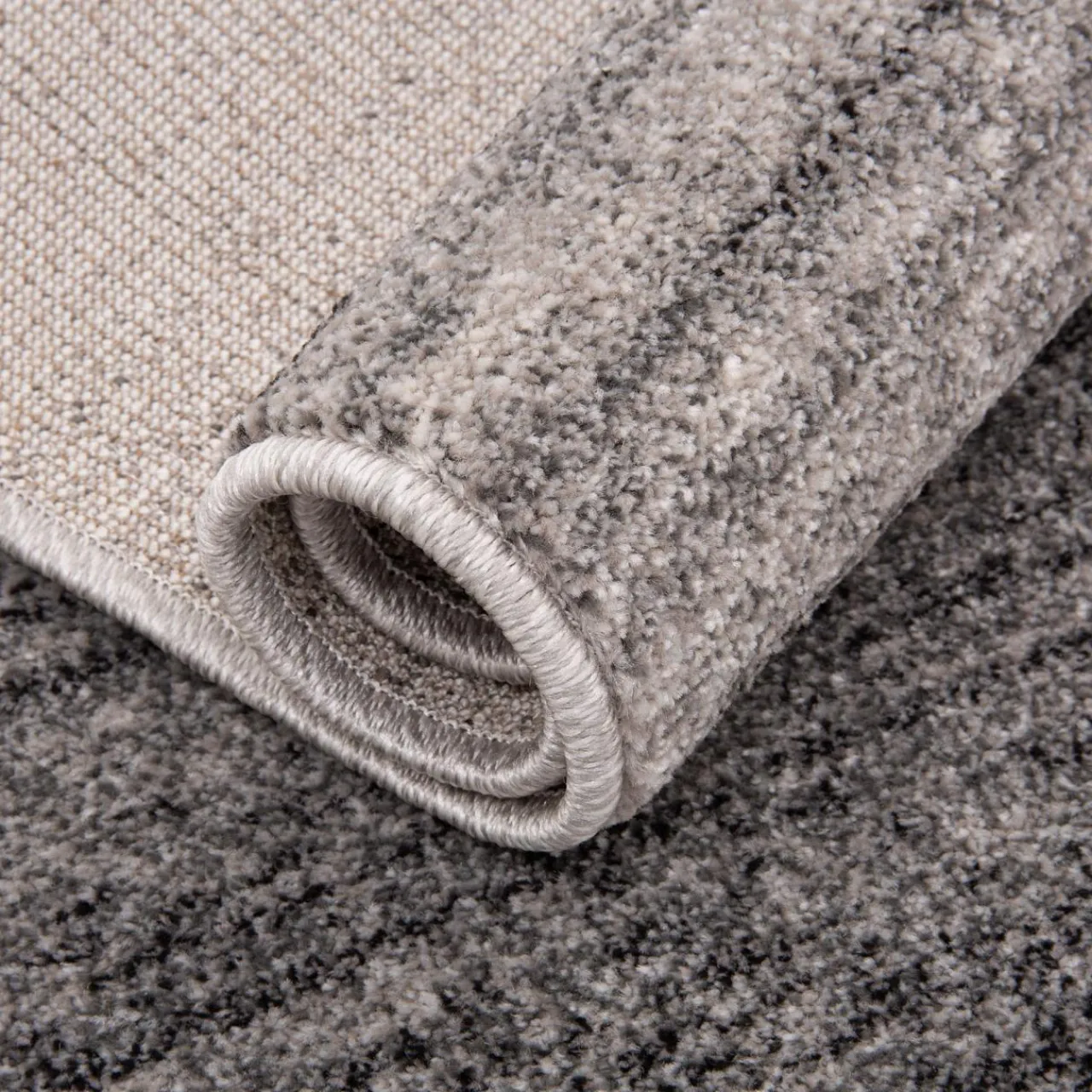 - Wzór dywanu jest abstrakcyjny. Przypomina nieco płótno malarskie, na którym malarz wykonał podmalówkę. Na górze i na dole rozlokowane są ciemniejsze odcienie szarości, na samym środku znajduje się beżowe pasmo. Ze względu na niejednolitą barwę, dywan sprawia wrażenie przecieranego i w związku z tym, pasować będzie również do wnętrz w stylu vintage.