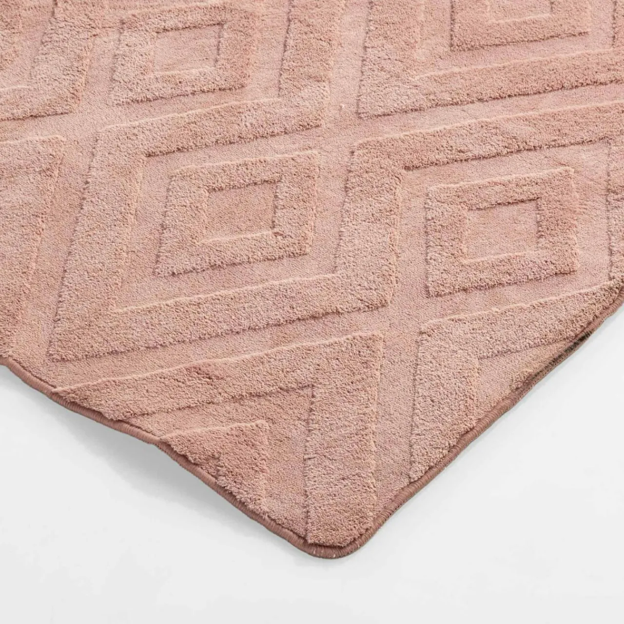 Geometryczny wzór w romby w różowej odsłonie. To dywan dla osób, które poszukują orzeźwienia w salonie albo sypialni.