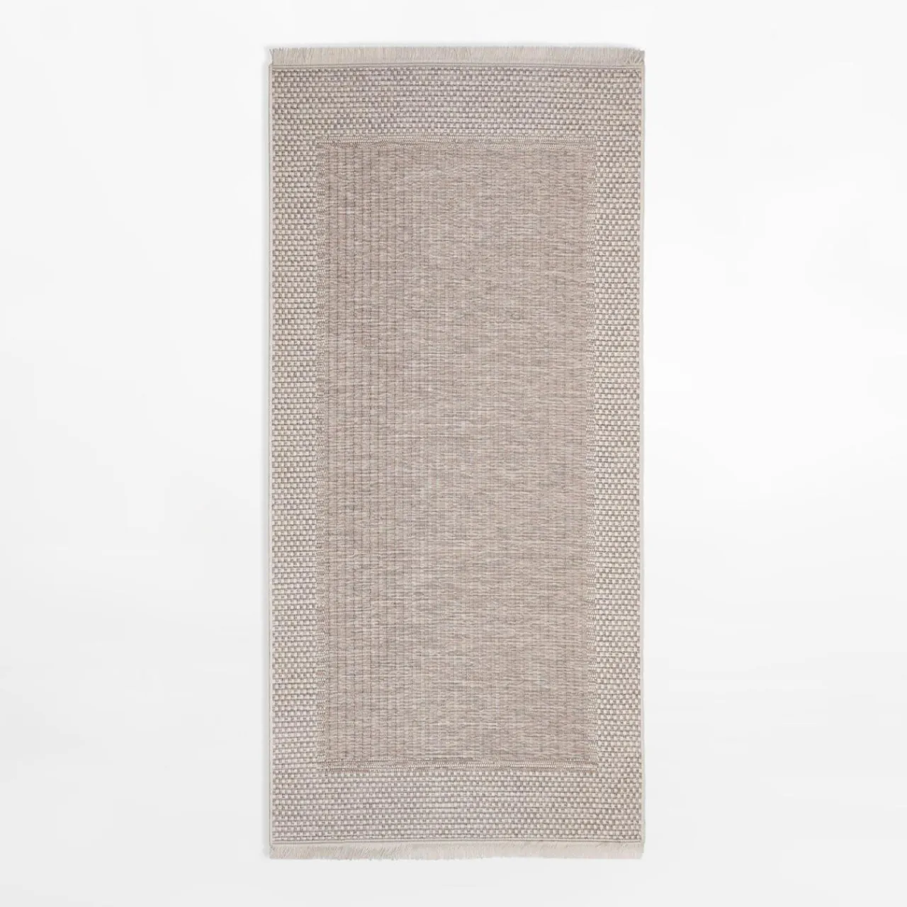 Otul swoją zewnętrzną lub wewnętrzną aranżację ciepłem dywanu ORIA. Beżowy kolor i ramka tworzą przytulny efekt.