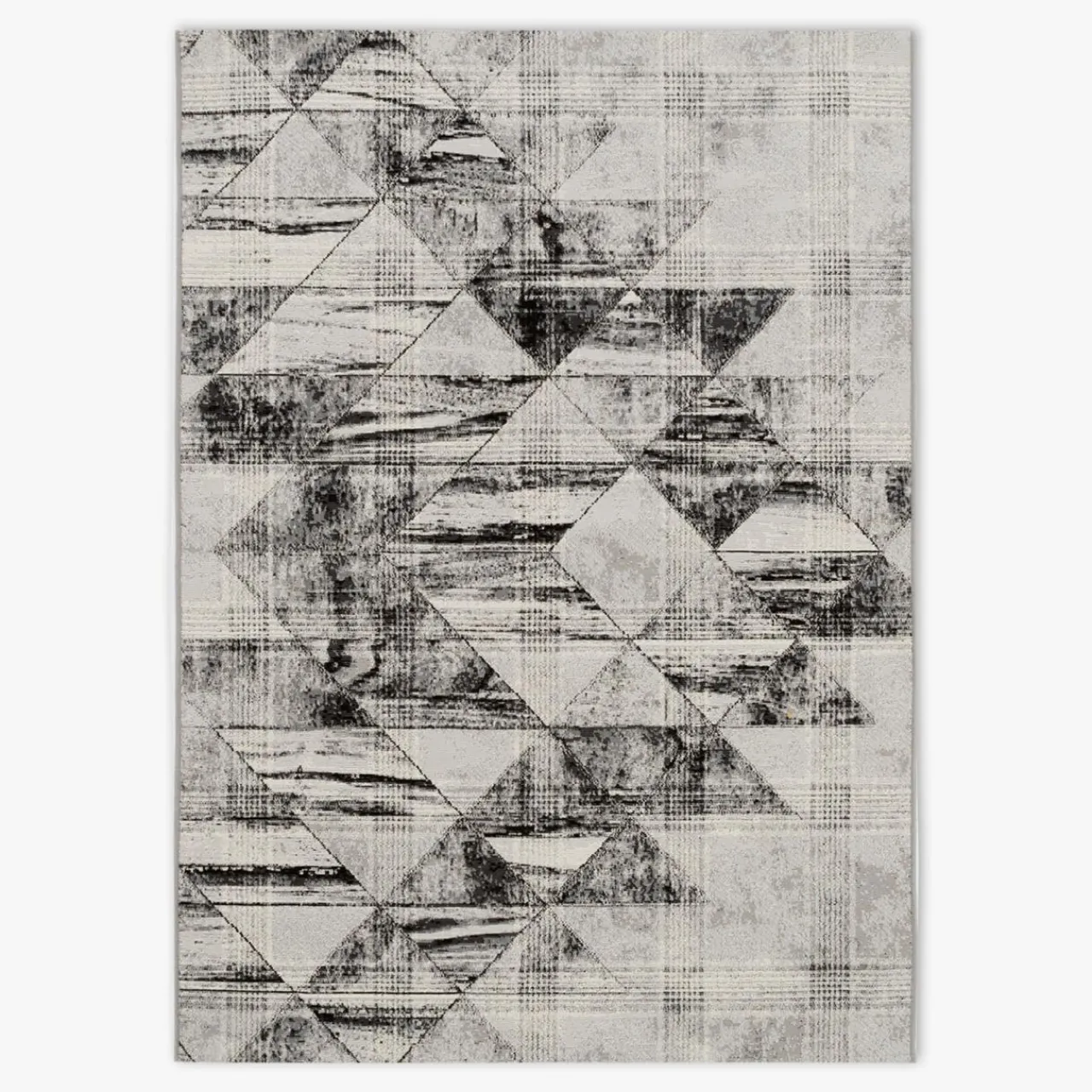 - Geometryczny wzór będący wariacją na temat trójkąta, osadzony w szarej kolorystyce, urozmaici nieco wystrój pomieszczenia. Jeśli lubisz minimalizm, ten dywan może być jedną z nielicznych dekoracji we wnętrzu.