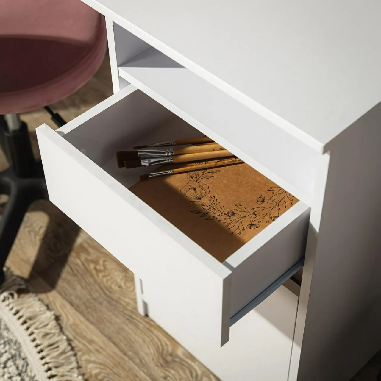 - Posiada podręczną szafkę, szufladę i wnękę pod blatem.