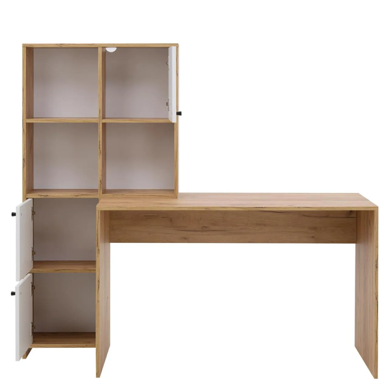 Do biurka dołączony jest regał z otwartymi i zamykanymi półkami . To rozwiązanie pomaga utrzymać porządek podczas nauki.