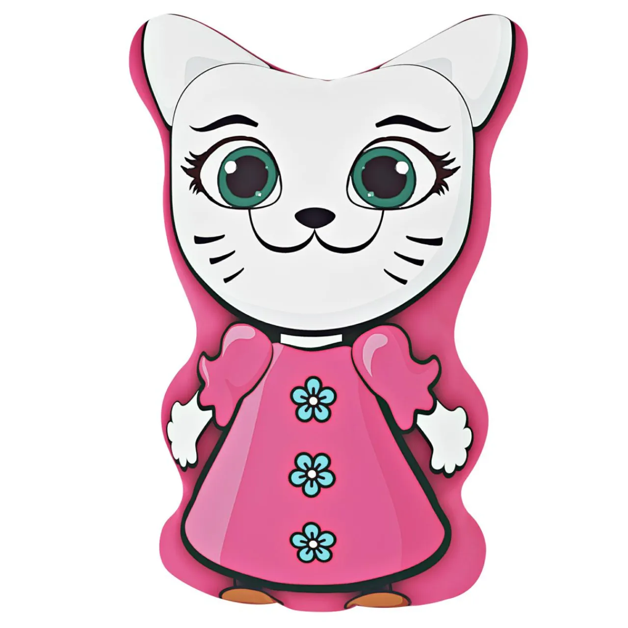 - Dziecięcy wzór znajduje się po obu stronach poduszki. Niezależnie od tego, jak ją ułożysz, biały kotek w różowej sukience zawsze wesoło się uśmiecha.