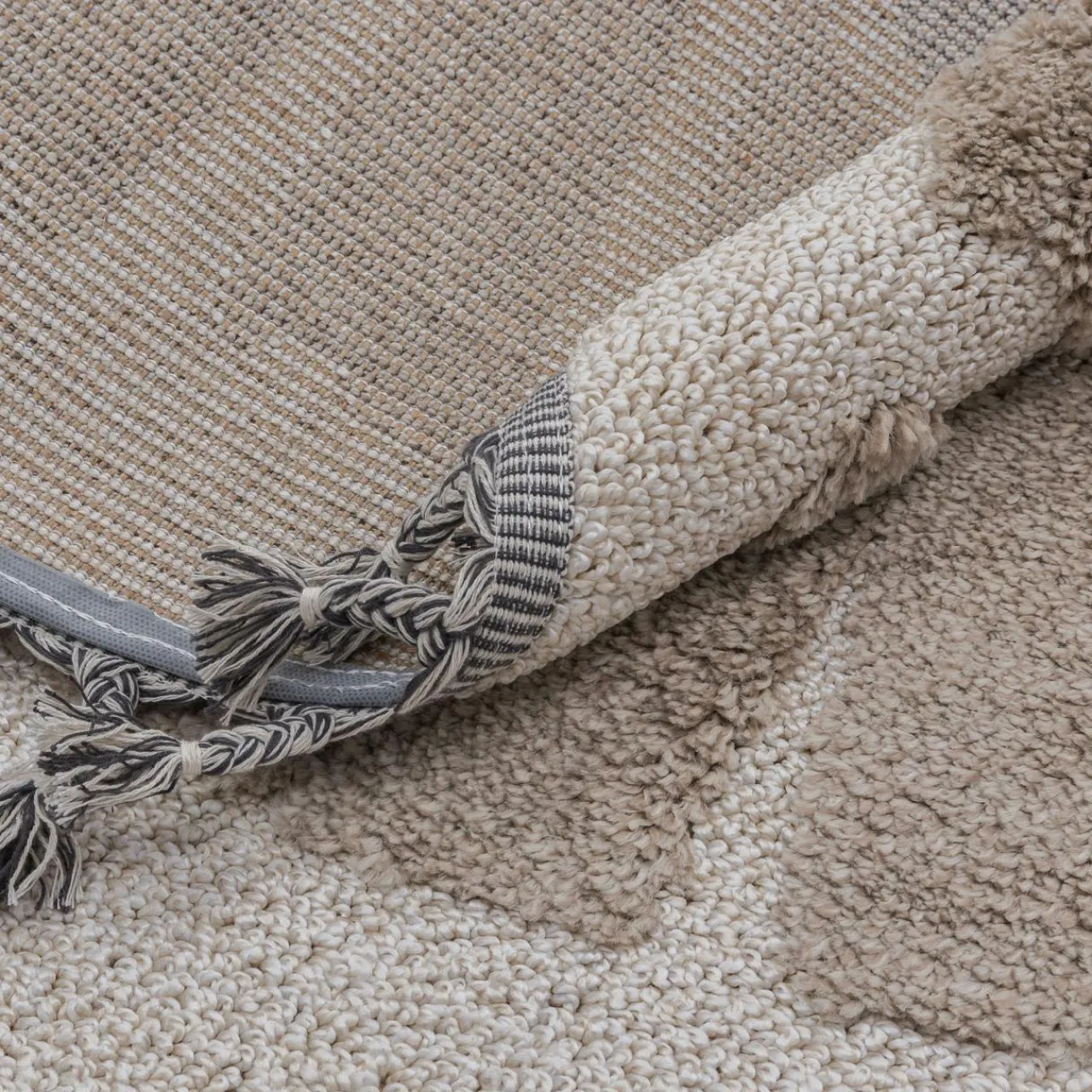 Okrągły dywan w kremowym kolorze i ozdobnymi frędzlami pasuje do jasnych mebli i ścian w naturalnych barwach.