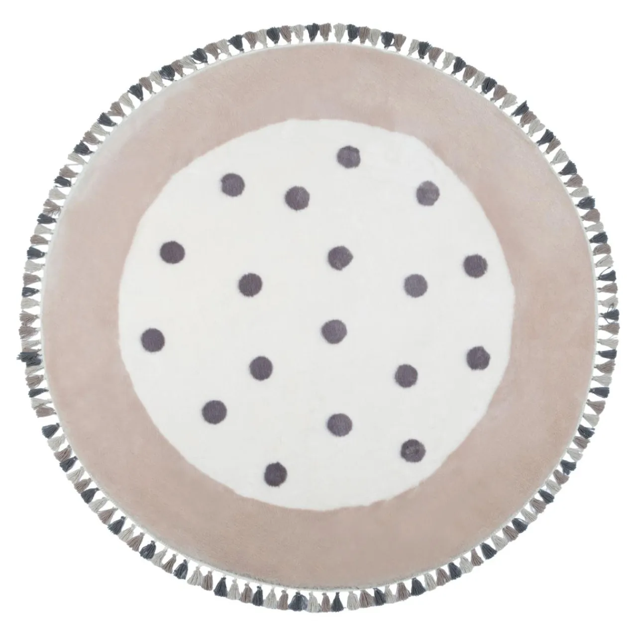 Okrągły dywan w beżowo-kremowym kolorze i z ozdobnymi frędzlami pasuje do jasnych mebli i ścian w naturalnych barwach.