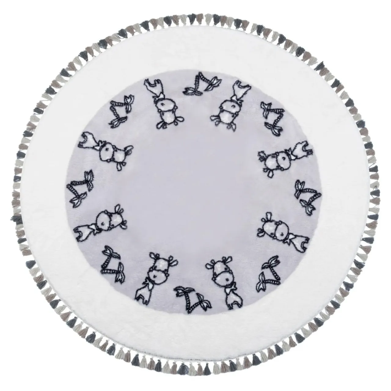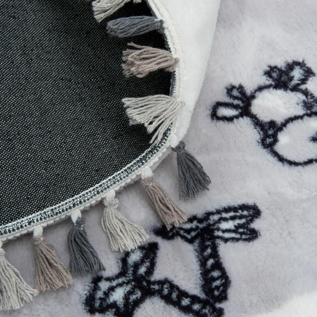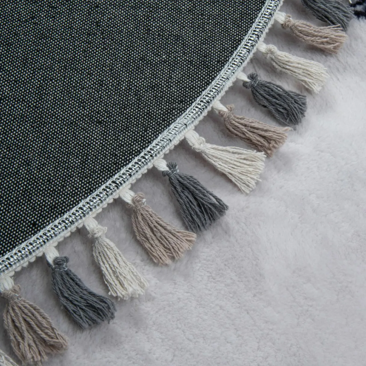 Okrągły dywan w biało-szarym kolorze i z ozdobnymi frędzlami pasuje do jasnych mebli i ścian w naturalnych barwach.
