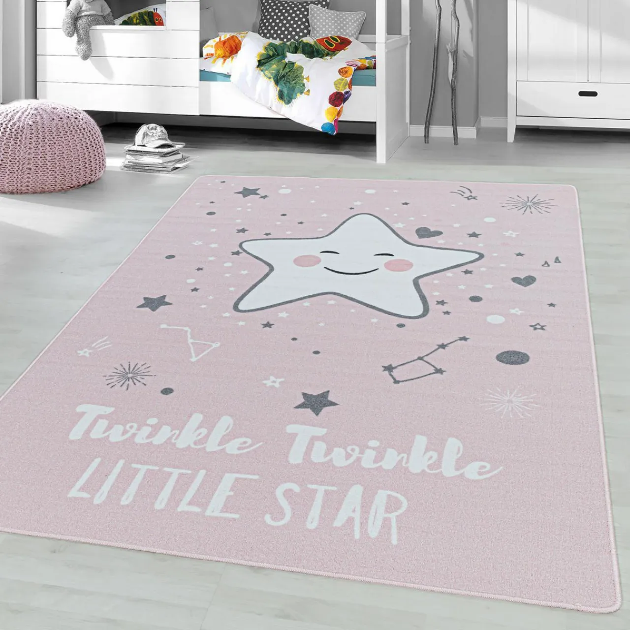 Twoje dziecko marzy o tym, aby przenieść się do bajkowego świata? Teraz to możliwe. Zdecyduj się na zakup różowego dywanu PLAY z motywem uśmiechniętej gwiazdki. Uroczy napis „Twinkle twinkle little star” odwołuje się do słów kołysanki, która w polskiej wersji językowej brzmi: „Mrugaj, mrugaj gwiazdko ma„.