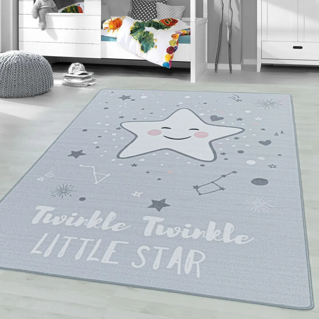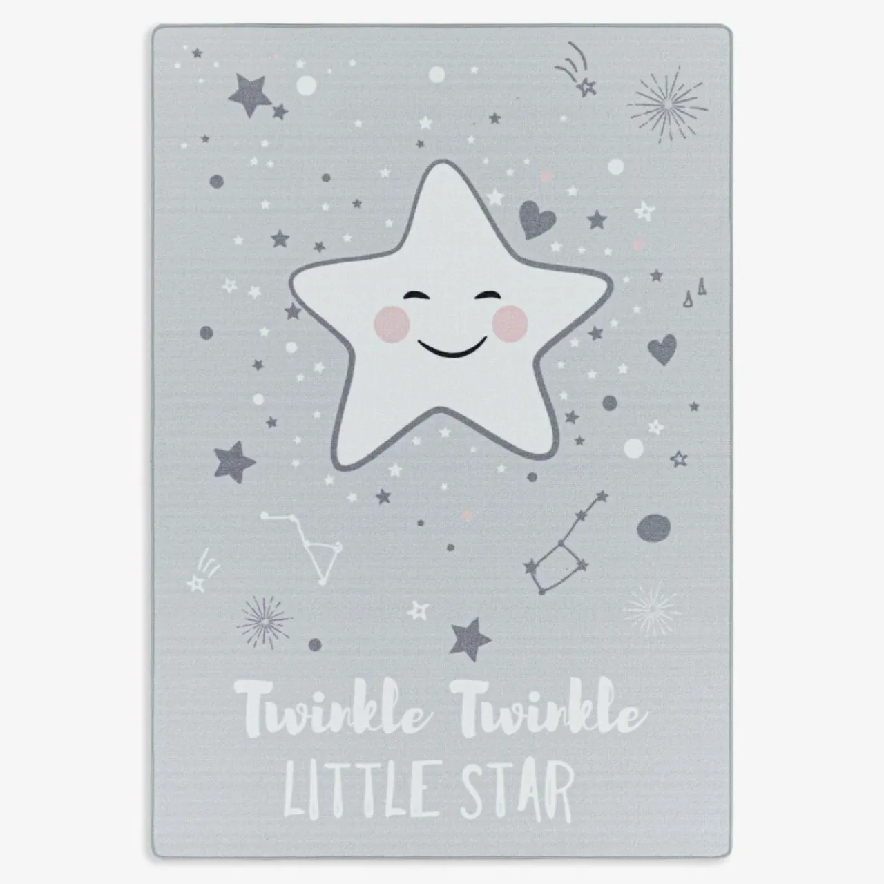 Twoje dziecko marzy o tym, aby przenieść się do bajkowego świata? Teraz to możliwe. Zdecyduj się na zakup szarego dywanu PLAY z motywem uśmiechniętej gwiazdki. Uroczy napis „Twinkle twinkle little star” odwołuje się do słów kołysanki, która w polskiej wersji językowej brzmi: „Mrugaj, mrugaj gwiazdko ma…”