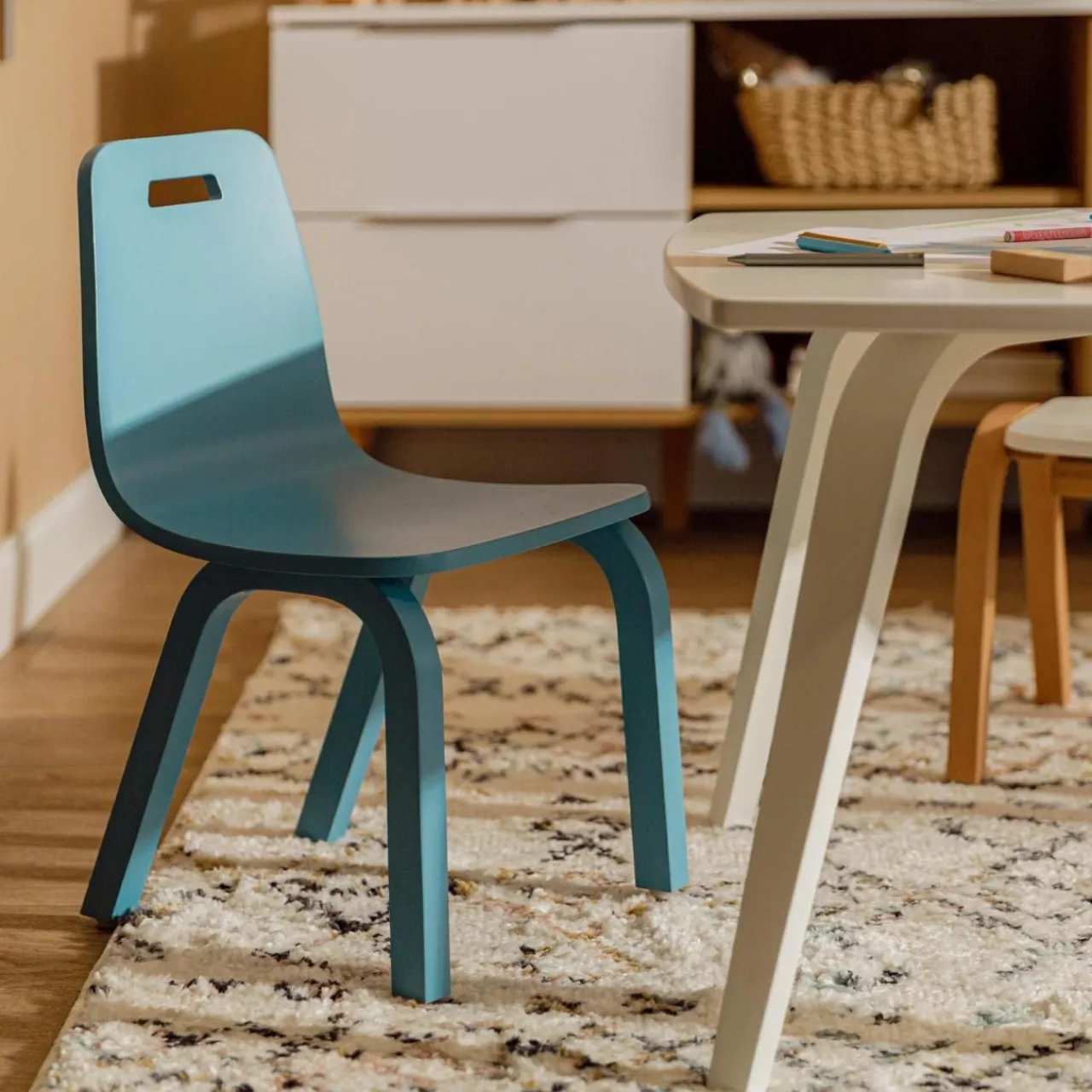 - Krzesełko wykonano ze sklejki drewna bukowego i zabezpieczono emalią.