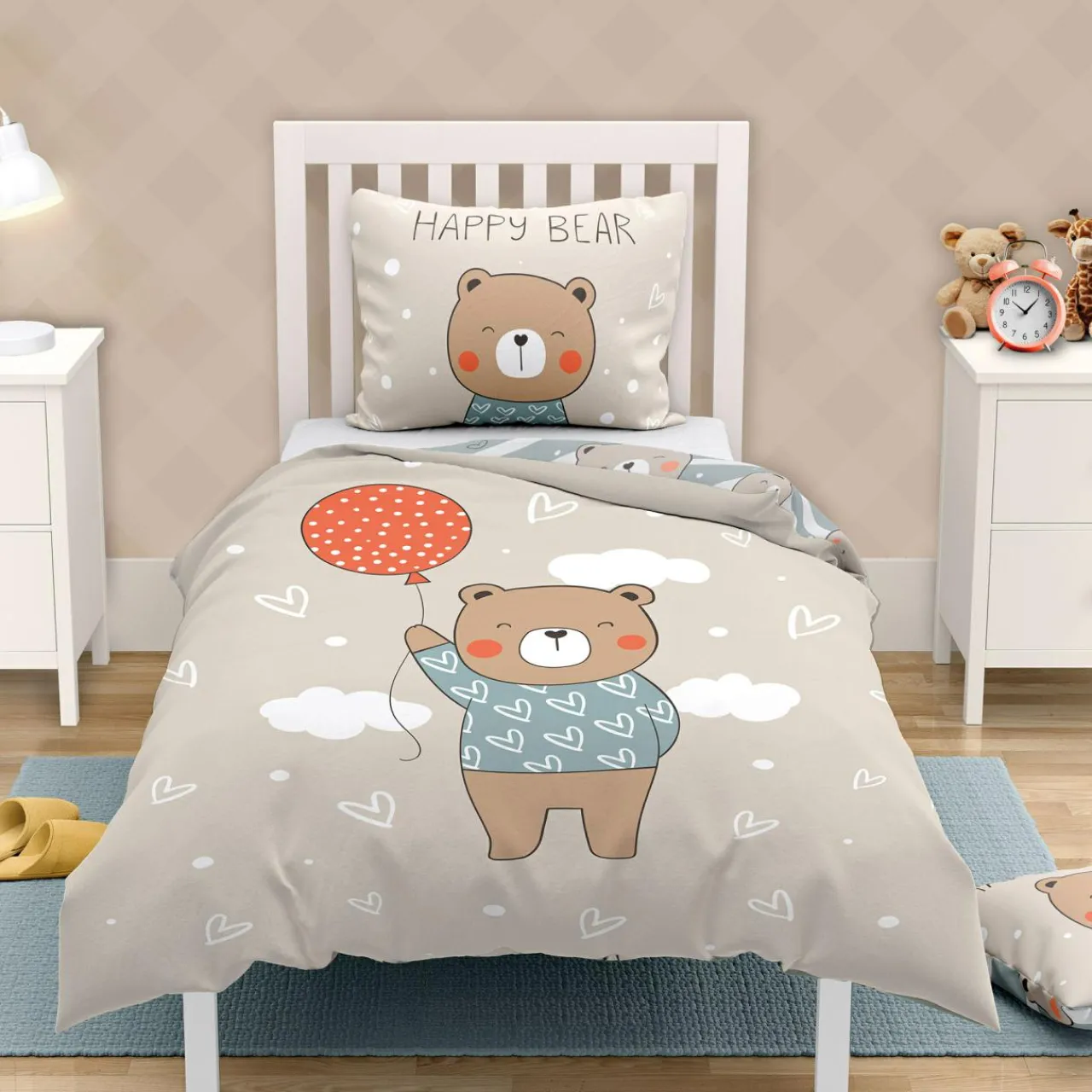- Pościel wykonana jest z miękkiej w dotyku bawełny, bezpiecznej dla skóry dziecka. Materiał przyjemnie otuli Twojego malucha przed snem. O kolorowe sny zadba wesoły miś (happy bear) w uroczym sweterku w serduszka.