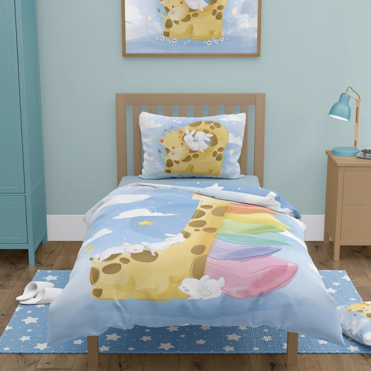 Stwórz sypialnię pełną uroku i beztroski! Bawełniana pościel z kolekcji PRZYTULAKI ŻYRAFA miękko otuli do snu i pomoże dziecku szybciej zasnąć.