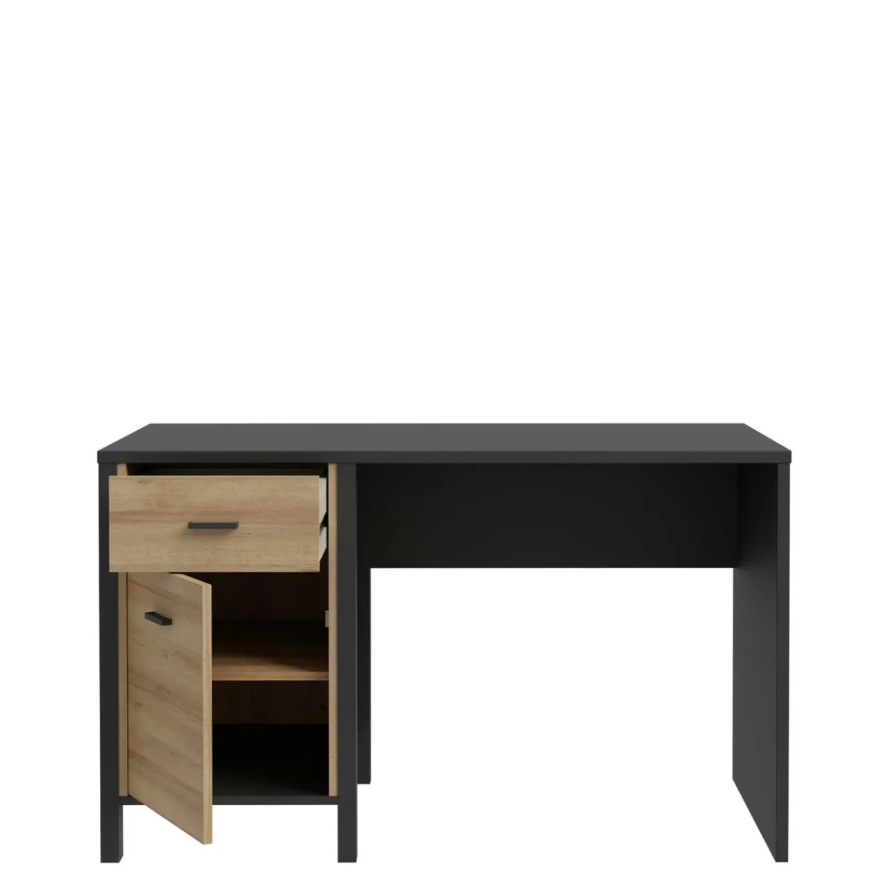 - Szuflada i szafka biurka zostały wyposażone w czarne, metalowe uchwyty.