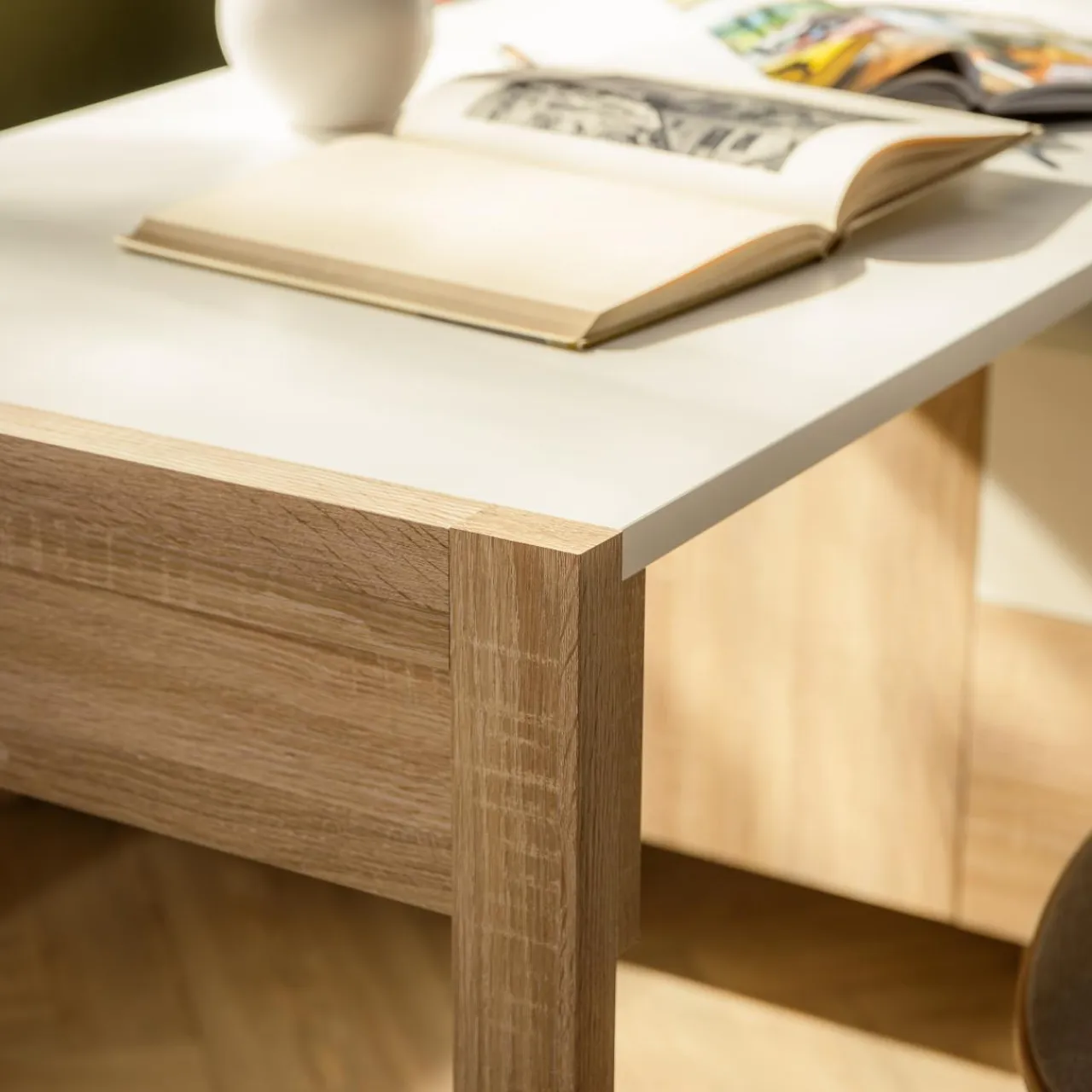 - Wykończenie utrzymane jest w barwie dębu sonoma połączonej z bielą. Dzięki temu wnętrze staje się bardziej przytulne i cieplejsze;