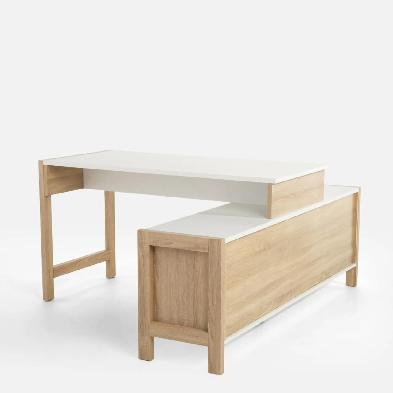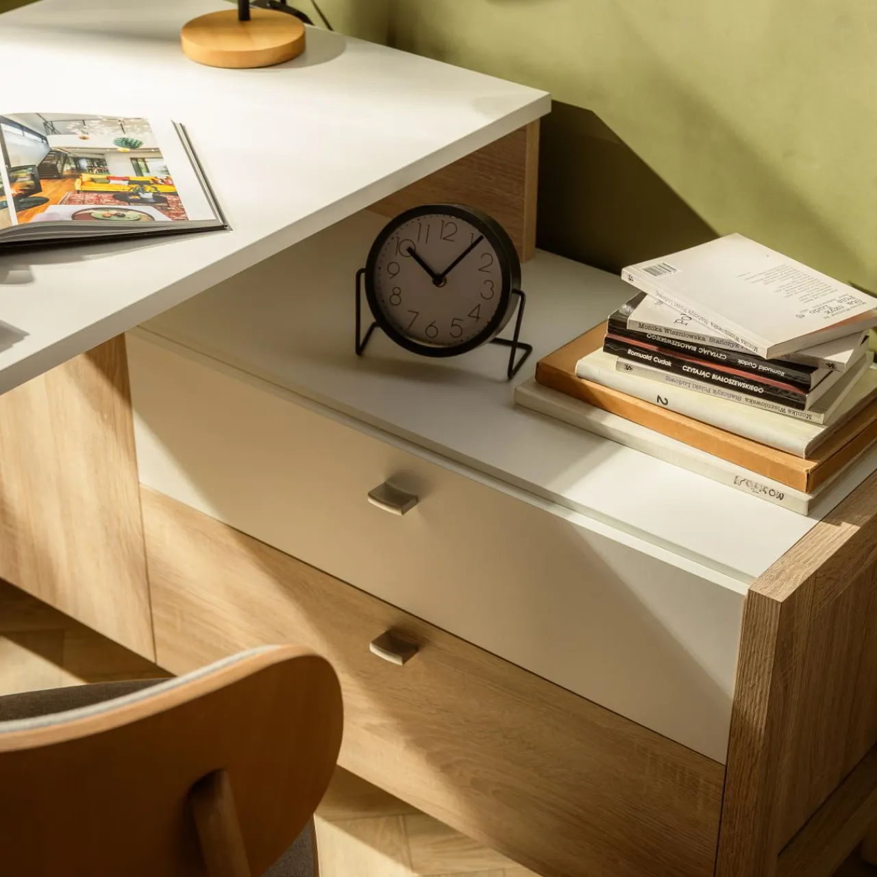 Połączenie biurka z szafką i szufladami zapewni Ci stały i szybki dostęp do najbardziej potrzebnych przedmiotów.