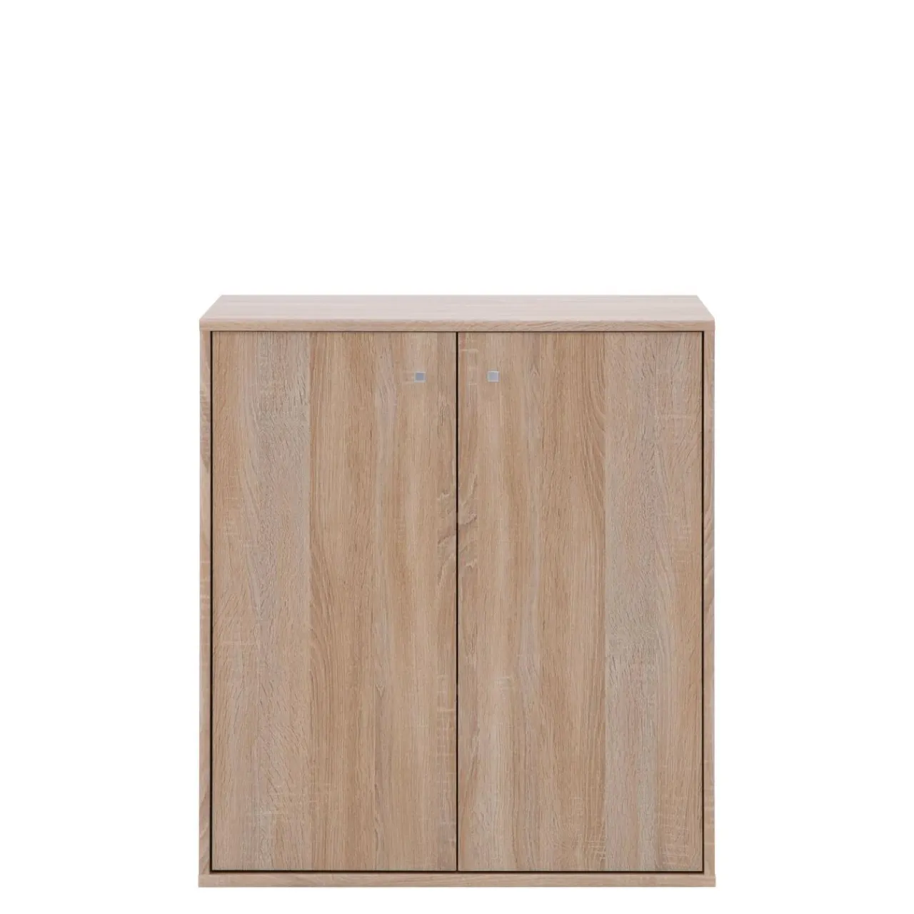 Komoda TEMPRA 2 posiada zamykane szafki z półkami. Została wykonana z płyty meblowej, pokrytej folią. Całość jest utrzymana w jasnej tonacji kolorystycznej dąb sonoma.